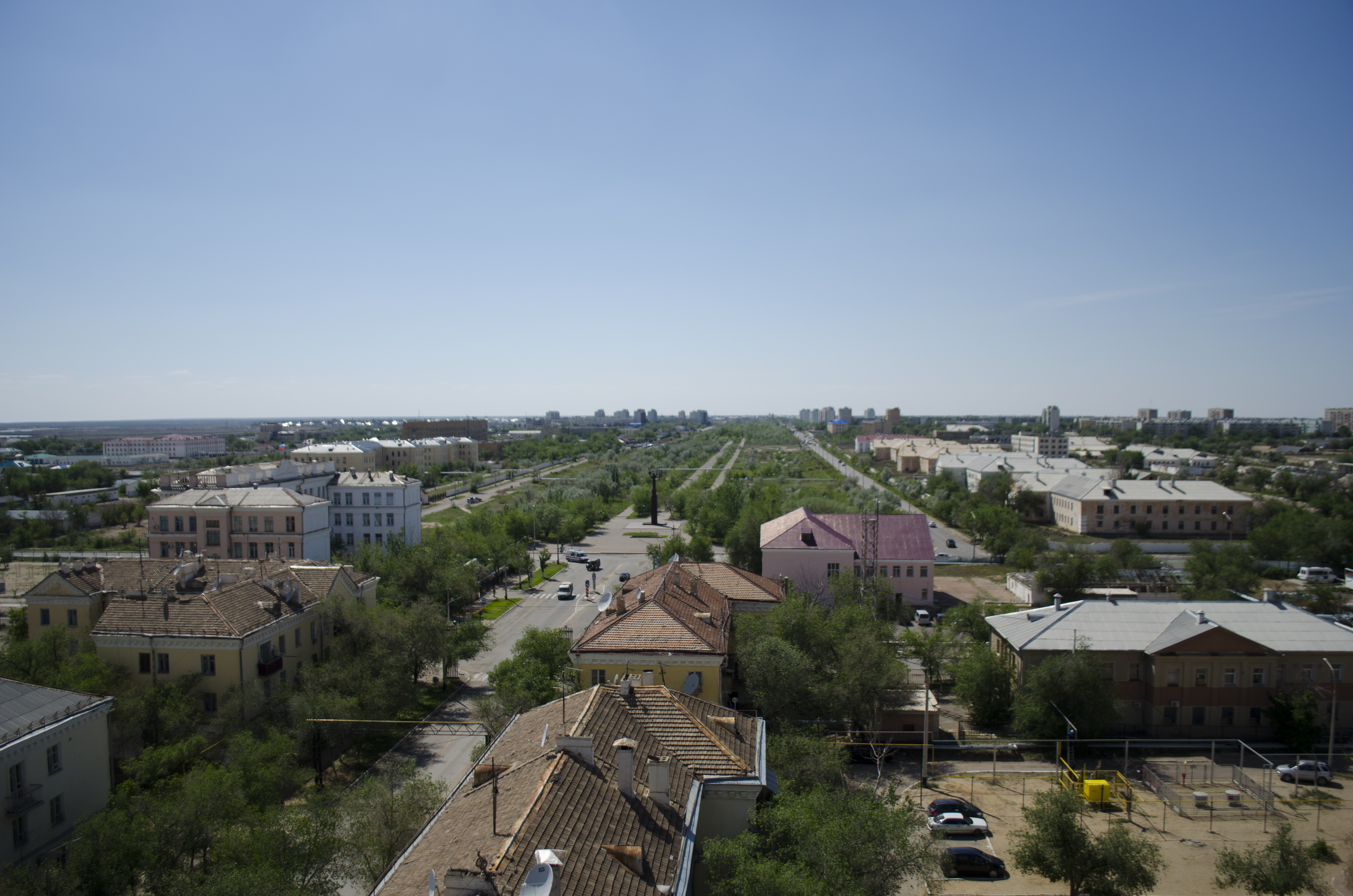 Главная улица г. Байконур. Nikon D5100, объектив Nikkor 18-55 мм VR II DX, фокус 18 мм, ISO-100, выдержка 1/2000 сек, f\3,5, Режим М. Съемка проводилась с крыши почти в полдень.