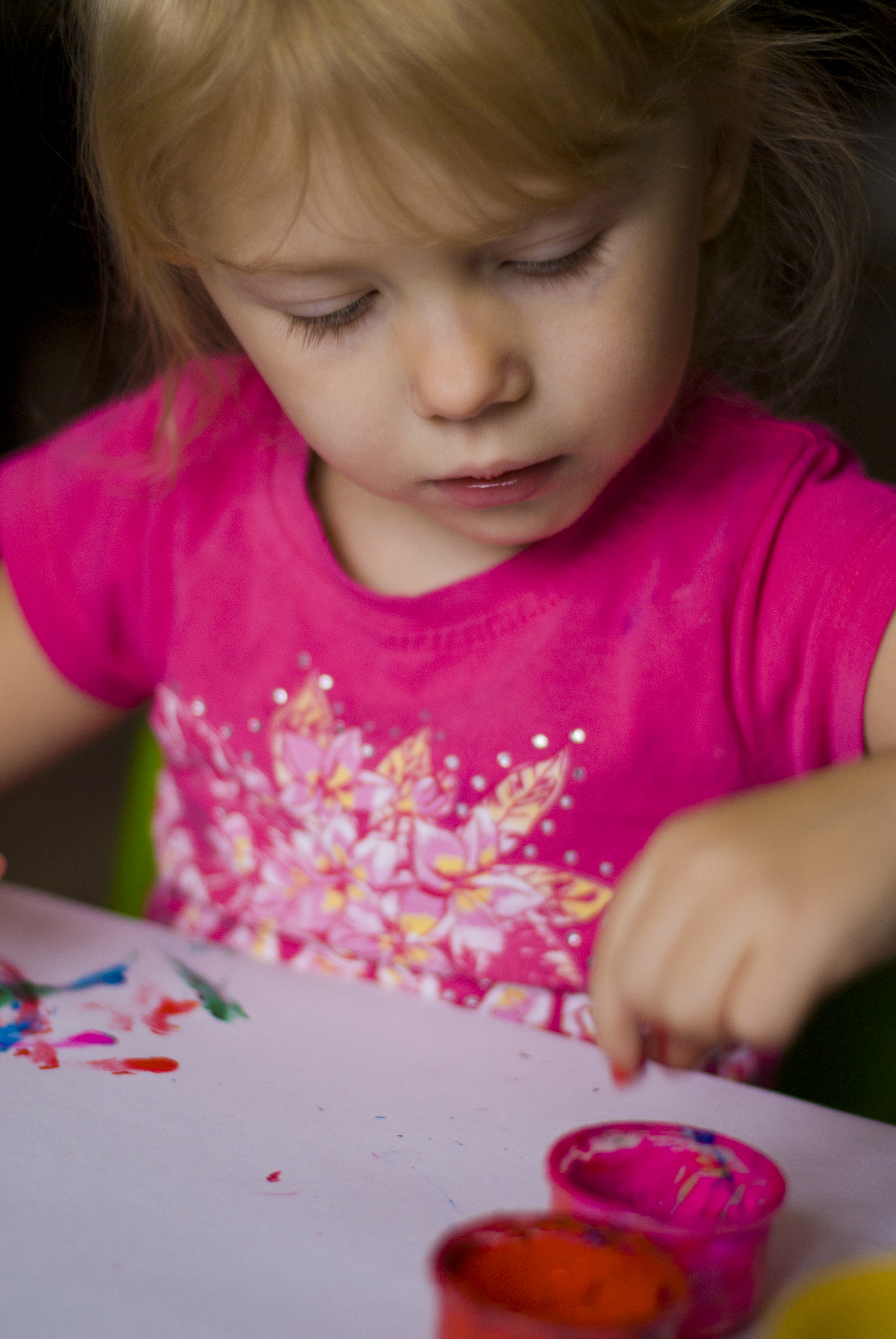 Рисование пальчиками одно из самих любимых занятий, хоть можем и кисточкой, но рисование пальчиками все равно самое любимой. Дочка полностью сфокусирована на процессе. Снимок сделан лицом к окну, возможно нужно было бы в профиль к окну, чтобы получилось боковое освещение