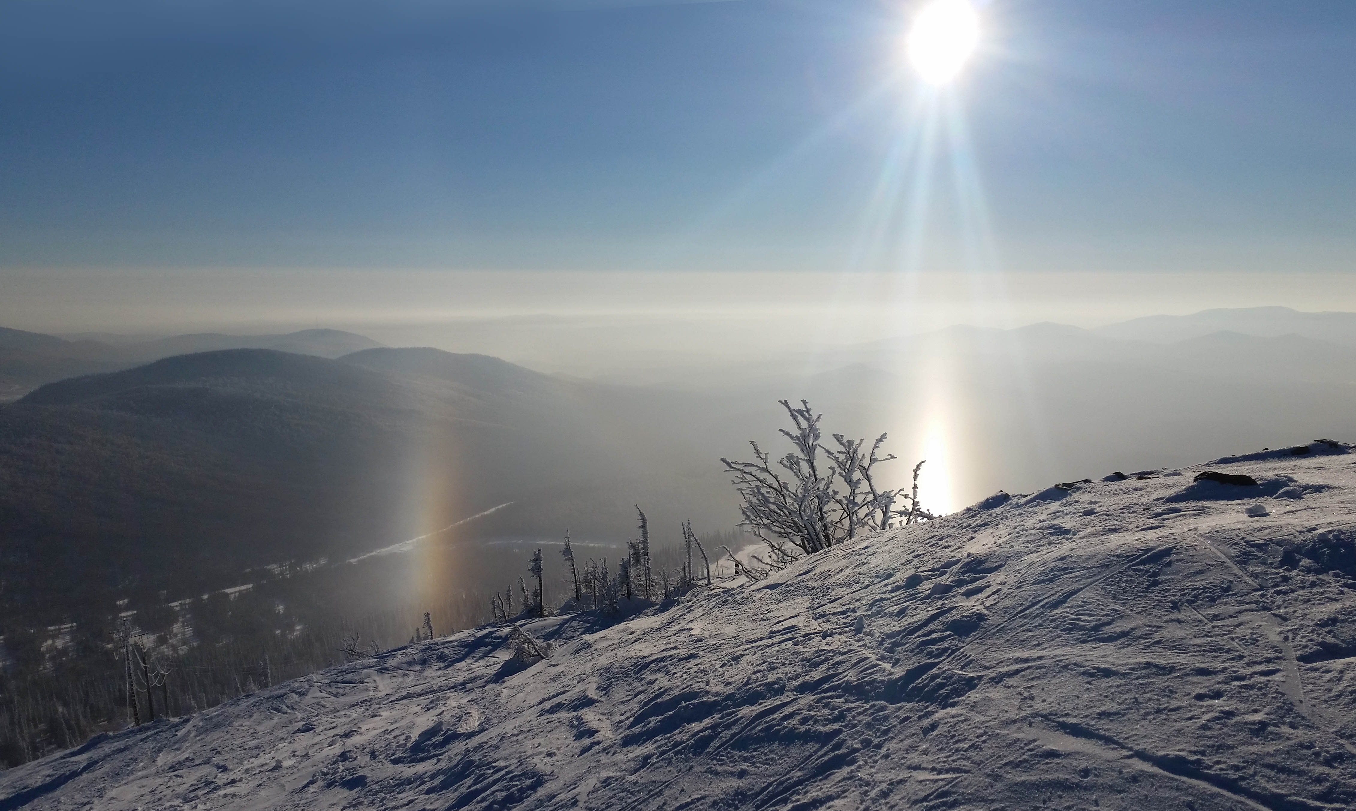 Шерегеш. Радуга в -30 в контровом свете. Отдельно интересен световой столб под солнцем. Контровой свет хорошо проработал склон. Снимок имеет отличную тональную перспективу. Снимок опять же на сотовый
