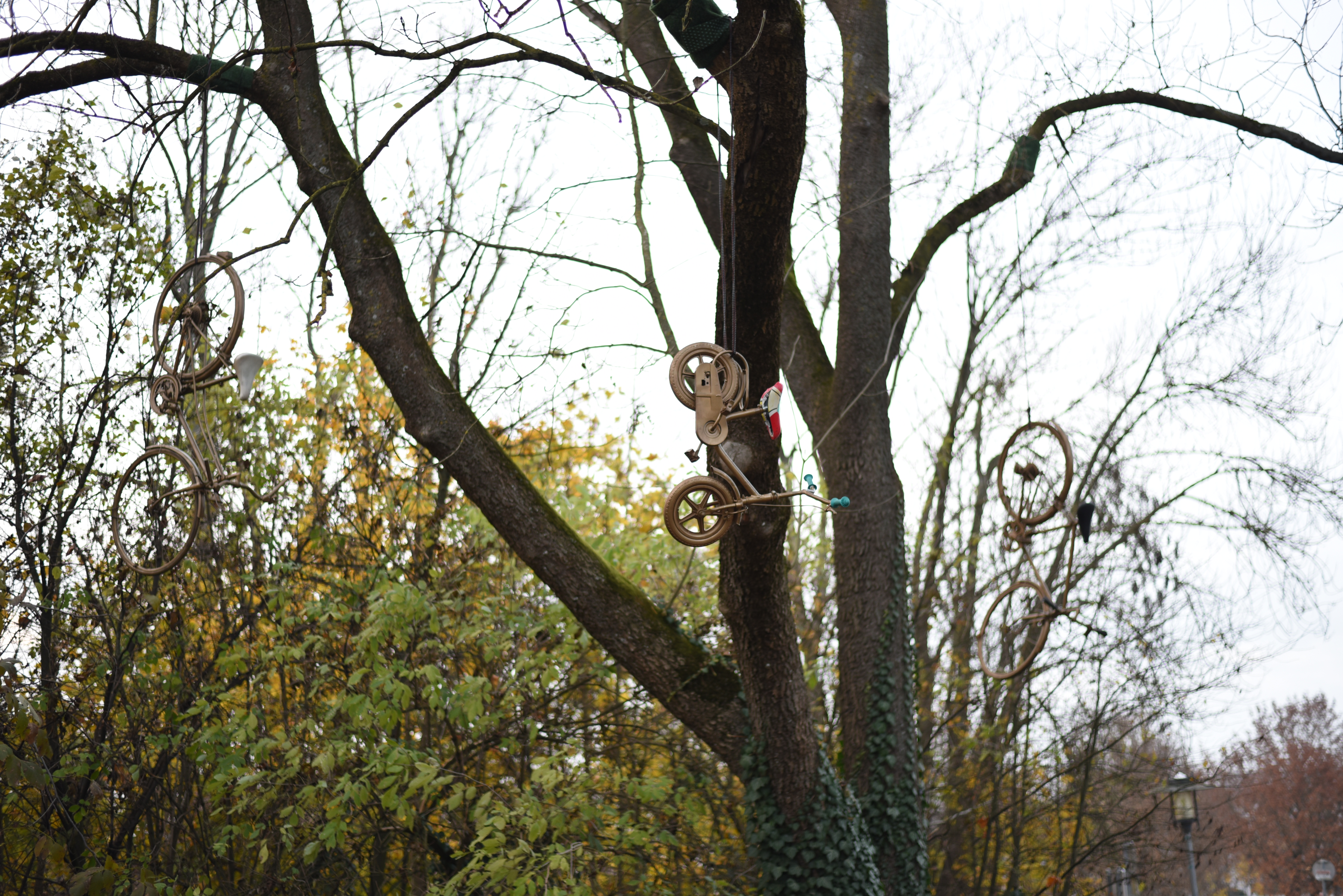 Велосипед висящий с дерева выглядит крайне необычно, несколько странно, но при этом заметно привлекает к себе внимание зрителя, создаётся некоторый сюжет, присутствует атмосфера и настроение.