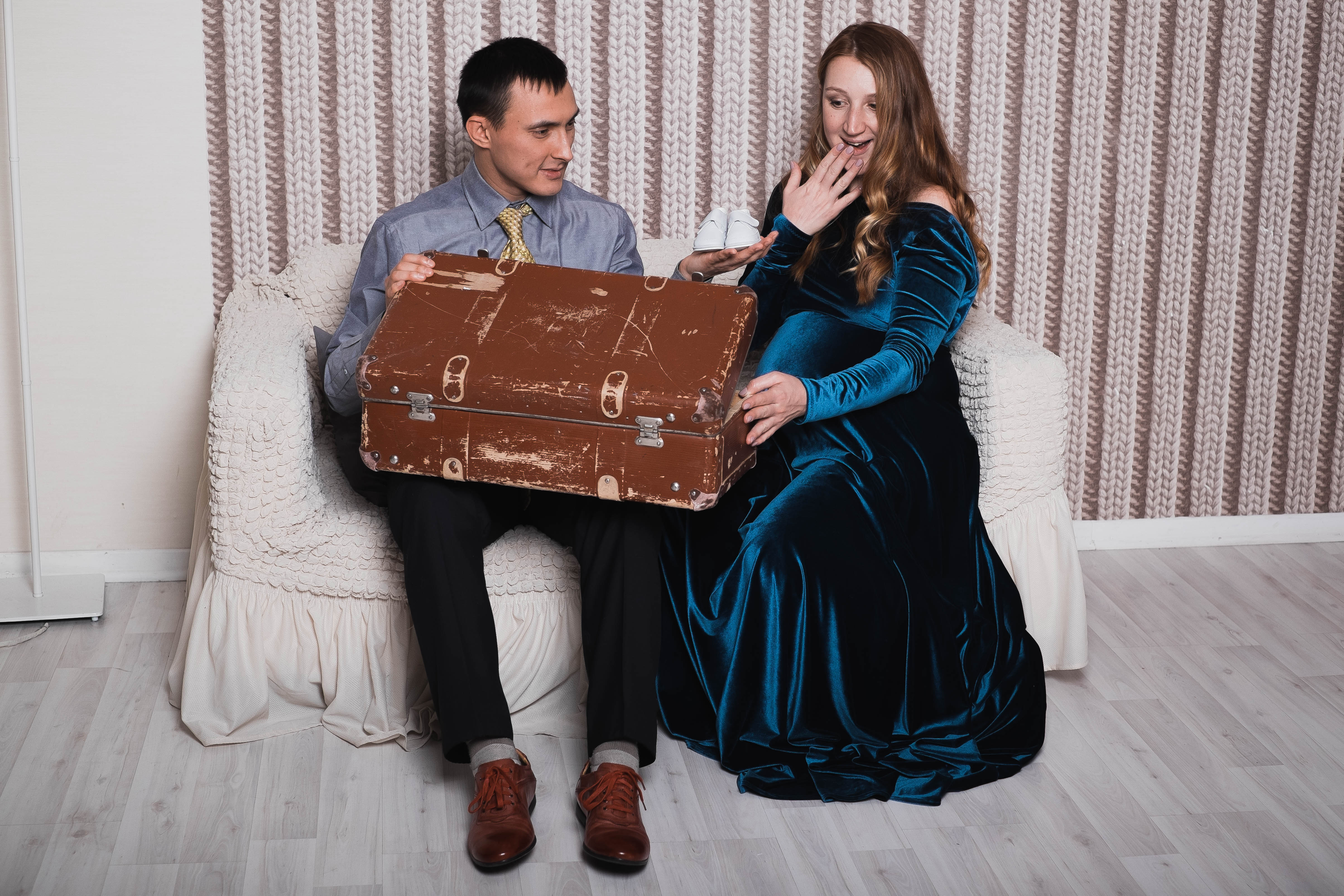 Из-за того, что чемодан прилип к животу, не сразу становится понятно, что девушка беременна. И, в целом, чемодан в данном сюжете смотрится не очень убедительно. Возможно, стоило остановить свой выбор на красивой подарочной коробке (не люльку же водружать на колени). А чемодан больше подходит для путешествий. Вот если бы парень дарил пару билетов на Мальдивы, тогда чемодан смотрелся бы органичнее.