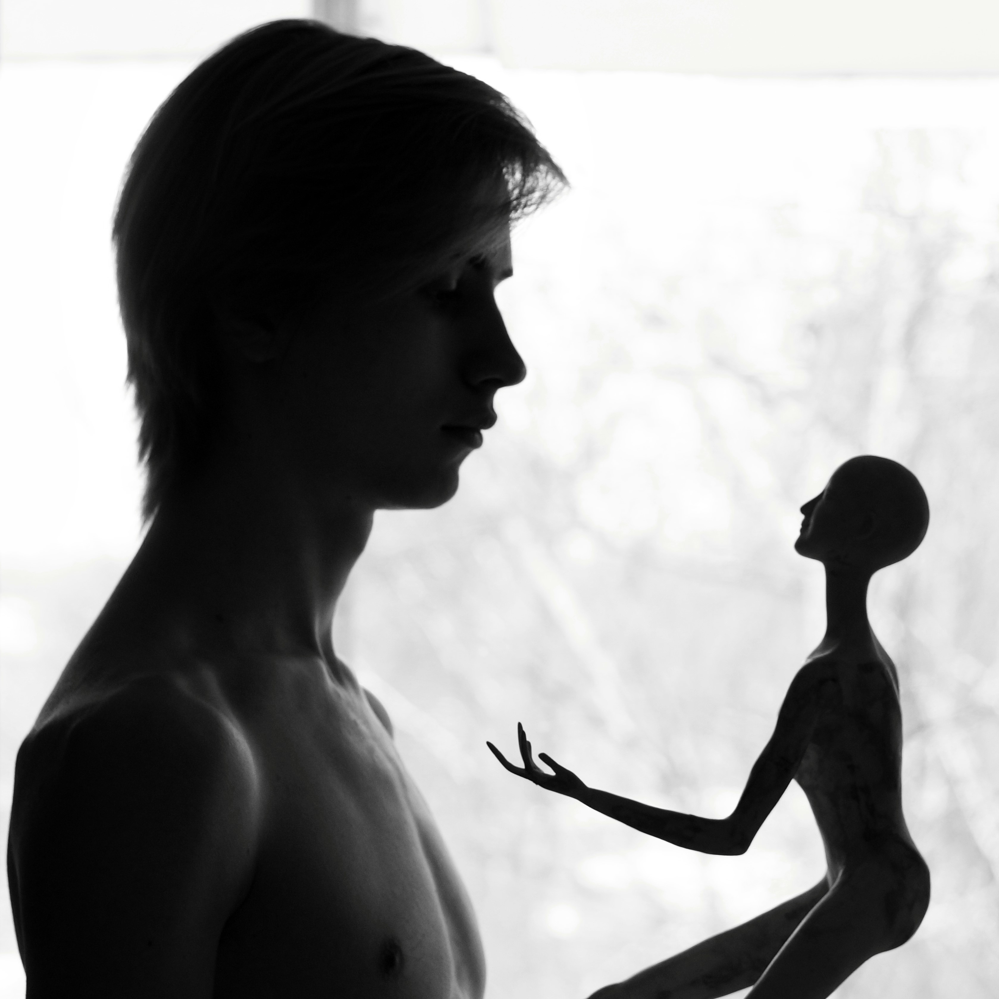 Интересный кадр у Вас получился. Удачная компоновка. Взаимодействие человека и фигурки подчёркивается за счёт направленных взглядов. Жест фигурки смотрится выразительно.