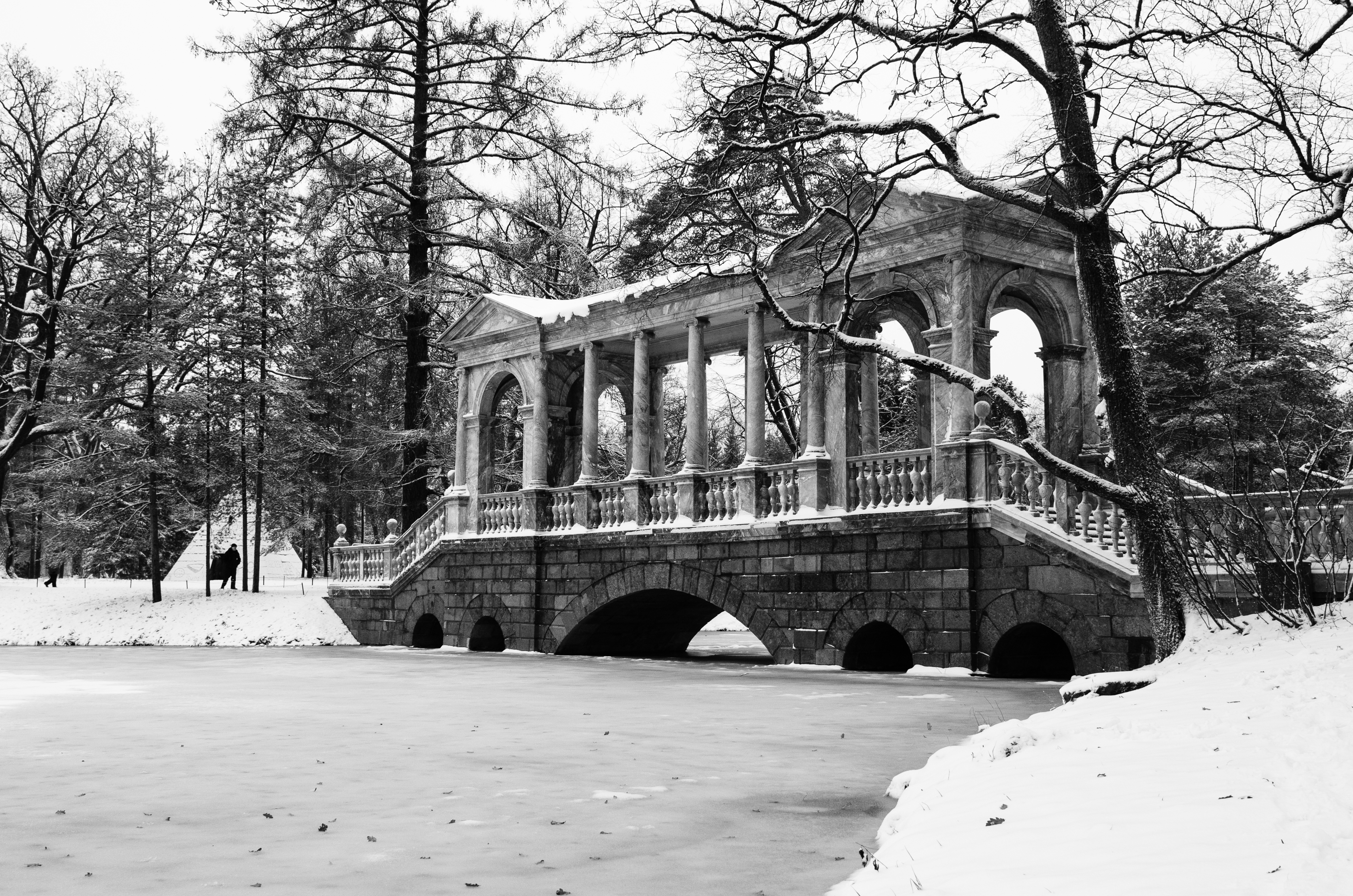 Пушкинский парк. На мой взгляд, удалось гармонично скомпоновать кадр, подчеркнуть фактуру. В кадре много треугольников, пирамида слева интересно перетекает в береговую линию, которая от кромки воды задает треугольник моста.
