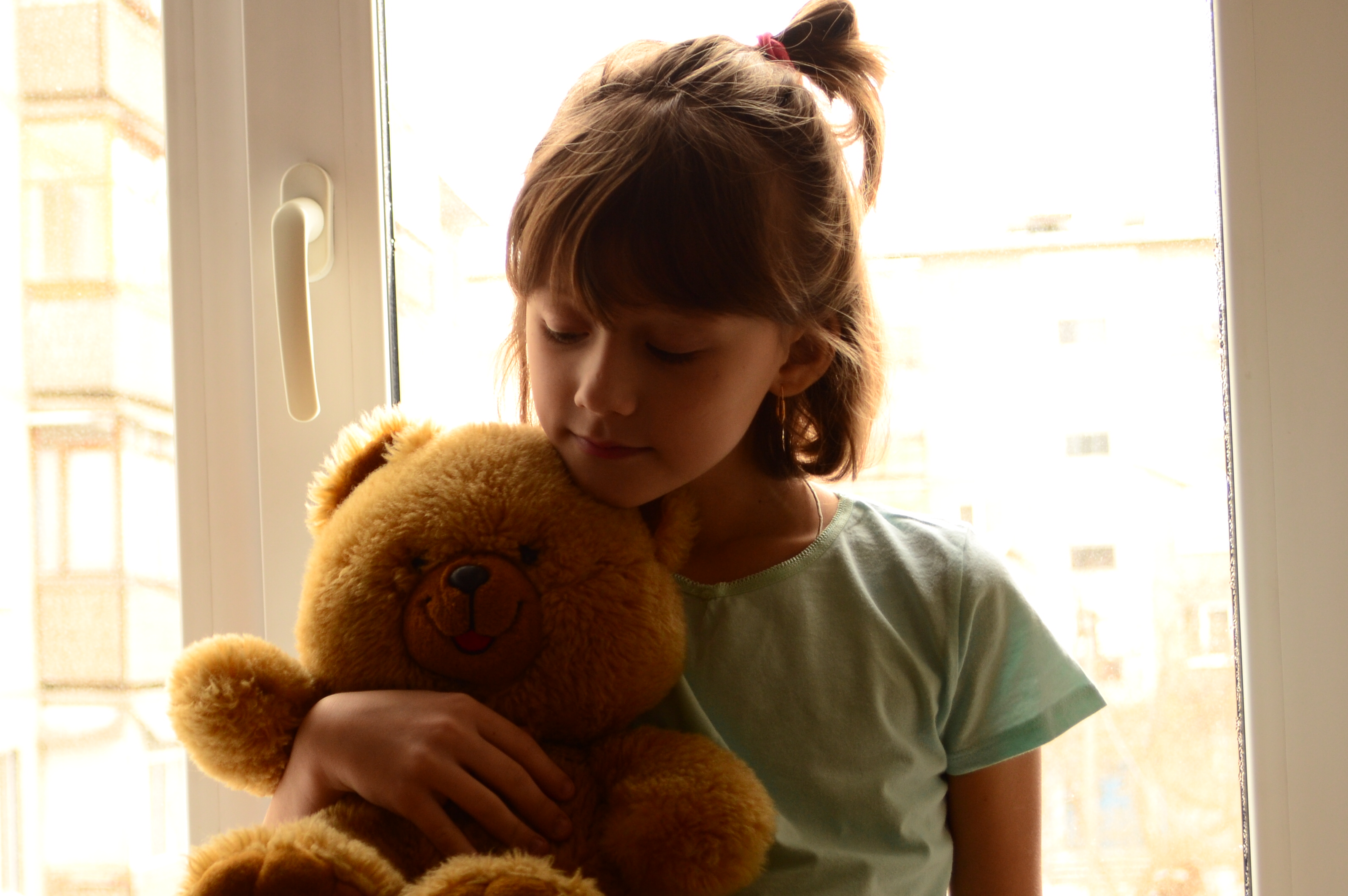 Снимок получился хорошим - домашняя, тёплая фотокарточка с добрым настроением. Освещение использовали контровое, как того и требует задание. Наклон снимка влево выглядит уместно, поддерживая направление взгляда и поворот головы девочки в сторону игрушки, хотя не стоило располагать близко к краю кадра заведомо вертикальную раму окна, чтобы не привлекать к этому наклону лишнего внимания.