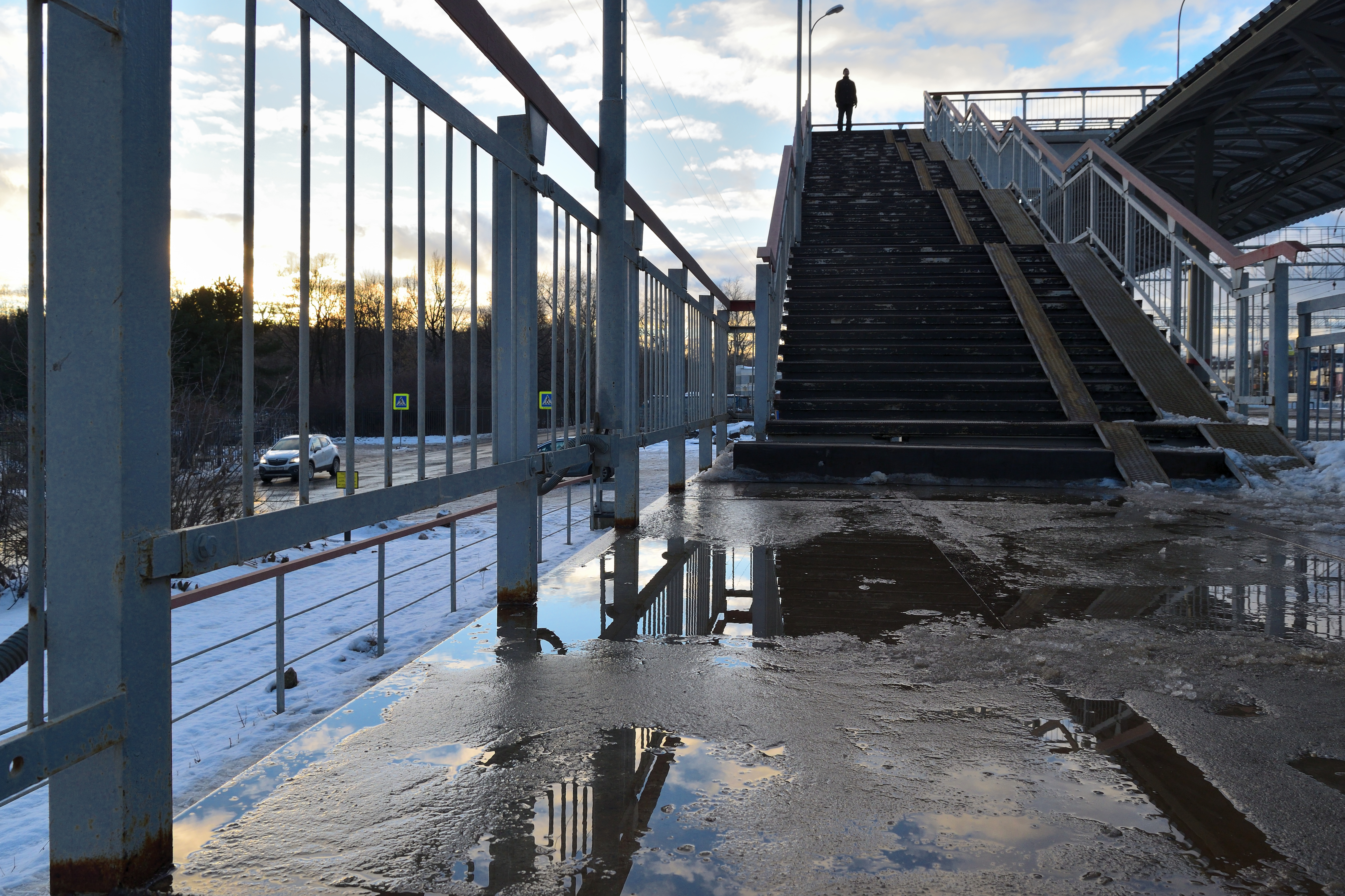 Здорово подобрали ракурс, при съемке с низкой точки удалось подчеркнуть отражения ритмичных ограждений в поверхности лужи.