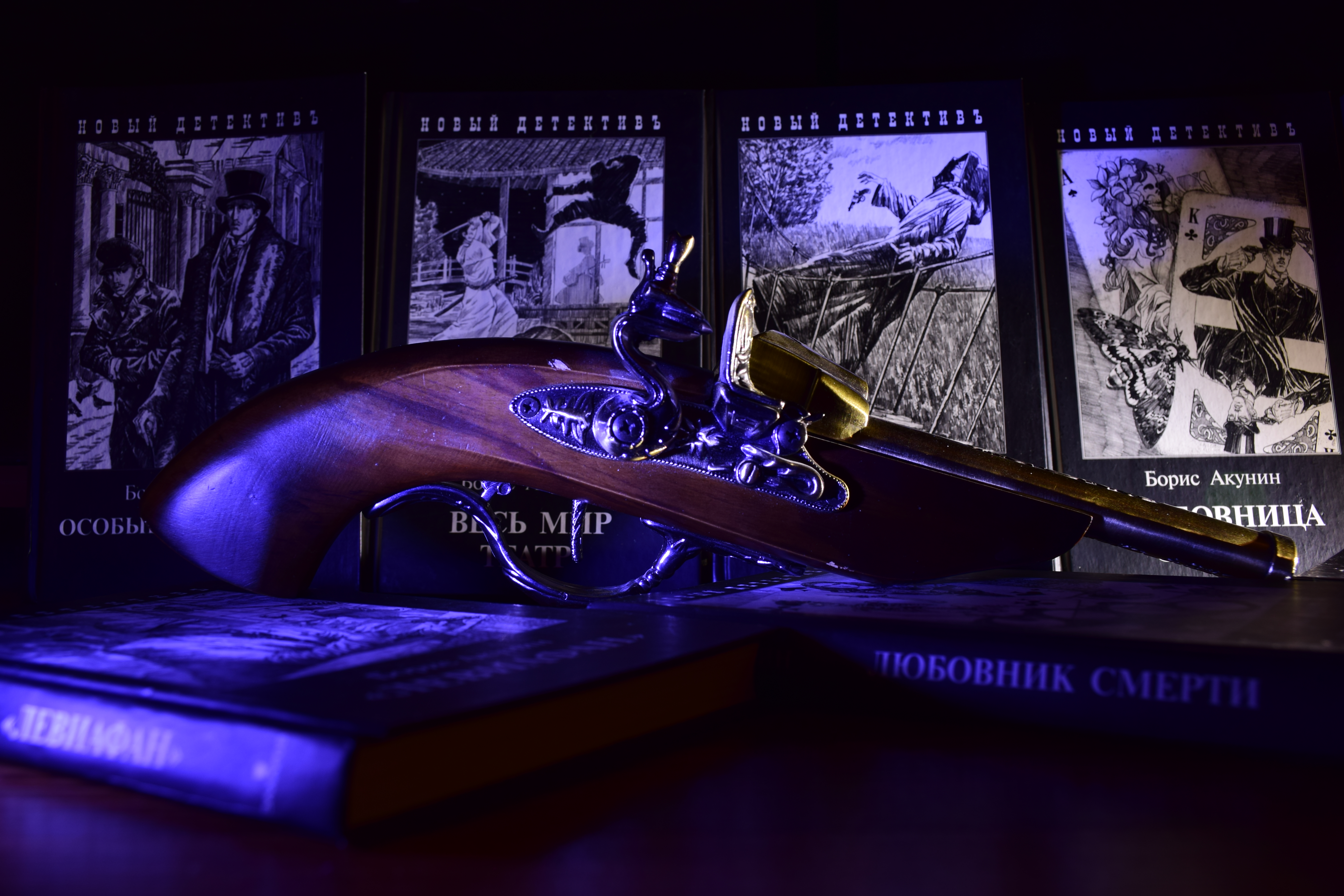 Однако компоновка не самая удачная. Наклоненный вниз ствол выглядит менее выразительно. Стоит расположить все же ствол в восходящей диагонали кадра , то есть приподнять его. Так как сам по себе пистолет является не устойчивым, его стоит расположить лежа на книгах , а снимать композицию сверху, разместить камеру над книгами и пистолетом.