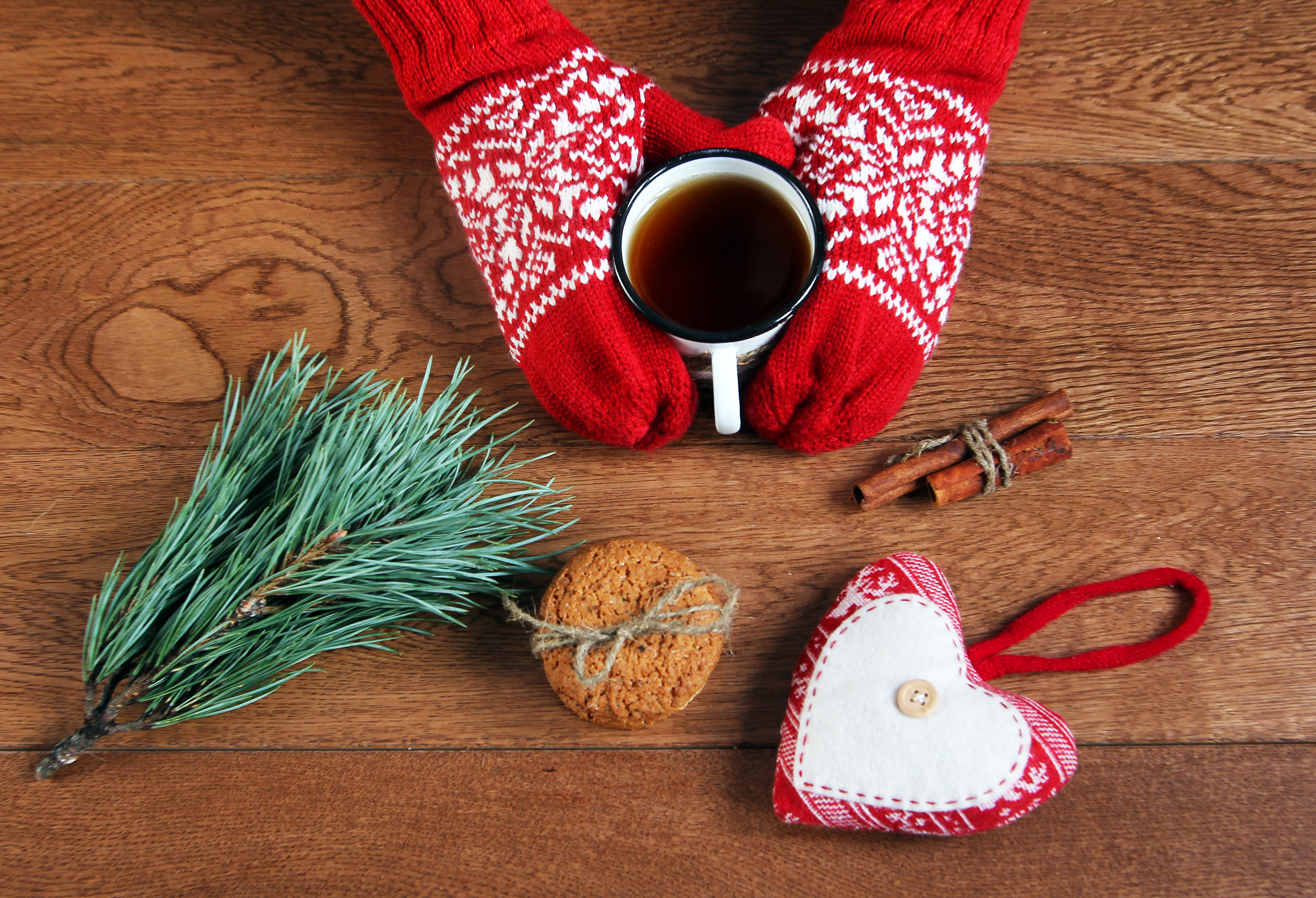 Сердечко создаёт хороший цветовой контраст и мощные акцент с красными варежками, палочки корицы сочетаются с печеньками, а ветвь хвои намекает на пред праздничную новогоднюю атмосферу.