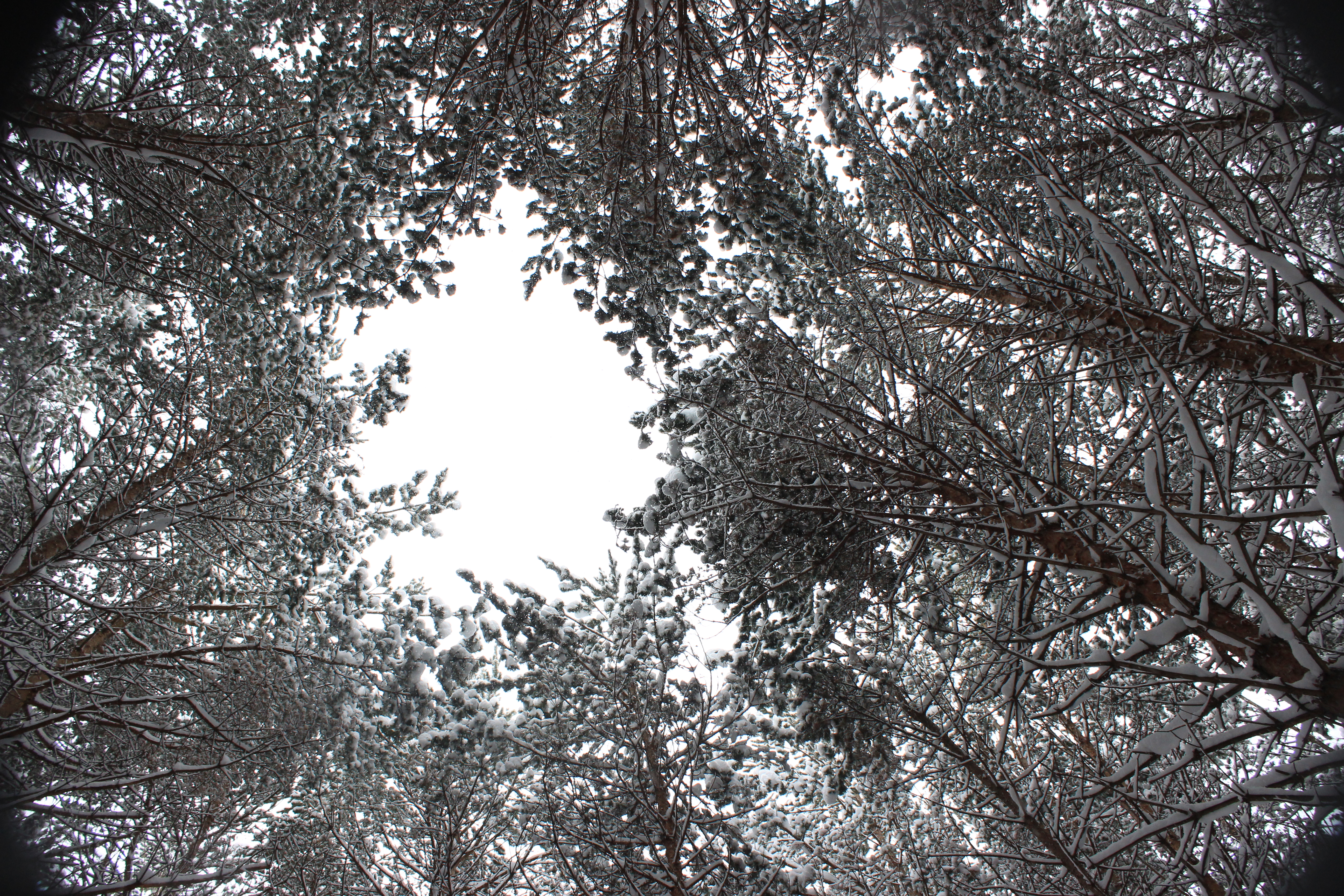Фотография в жанре пейзажа. С необыкновенным ракурсом, с очень эффектными видом, потрясающим масштабом и динамичностью форм. Деревья тянутся ввысь и сходятся к одной точке.
