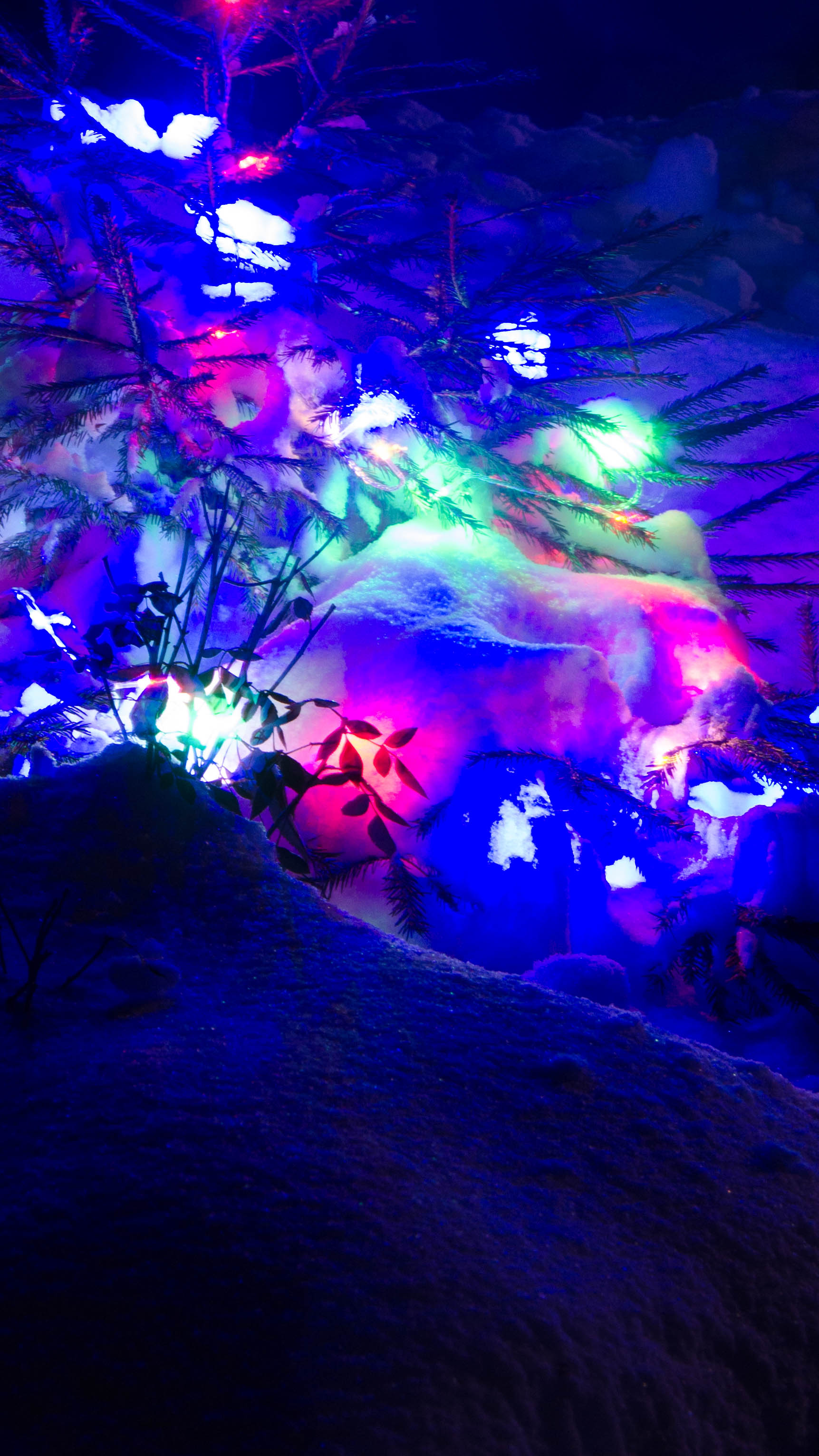 акцент с помощью света.Я калрировал кадр так , что бы свет от елки подчеркивал текстуру снега.На кадре получилось темный смысловой цент на фоне светлого пятна.Светлое и темное пятно скадрированы в точка пересечения линий.Голубое свечение подчеркивает мороз на улице.