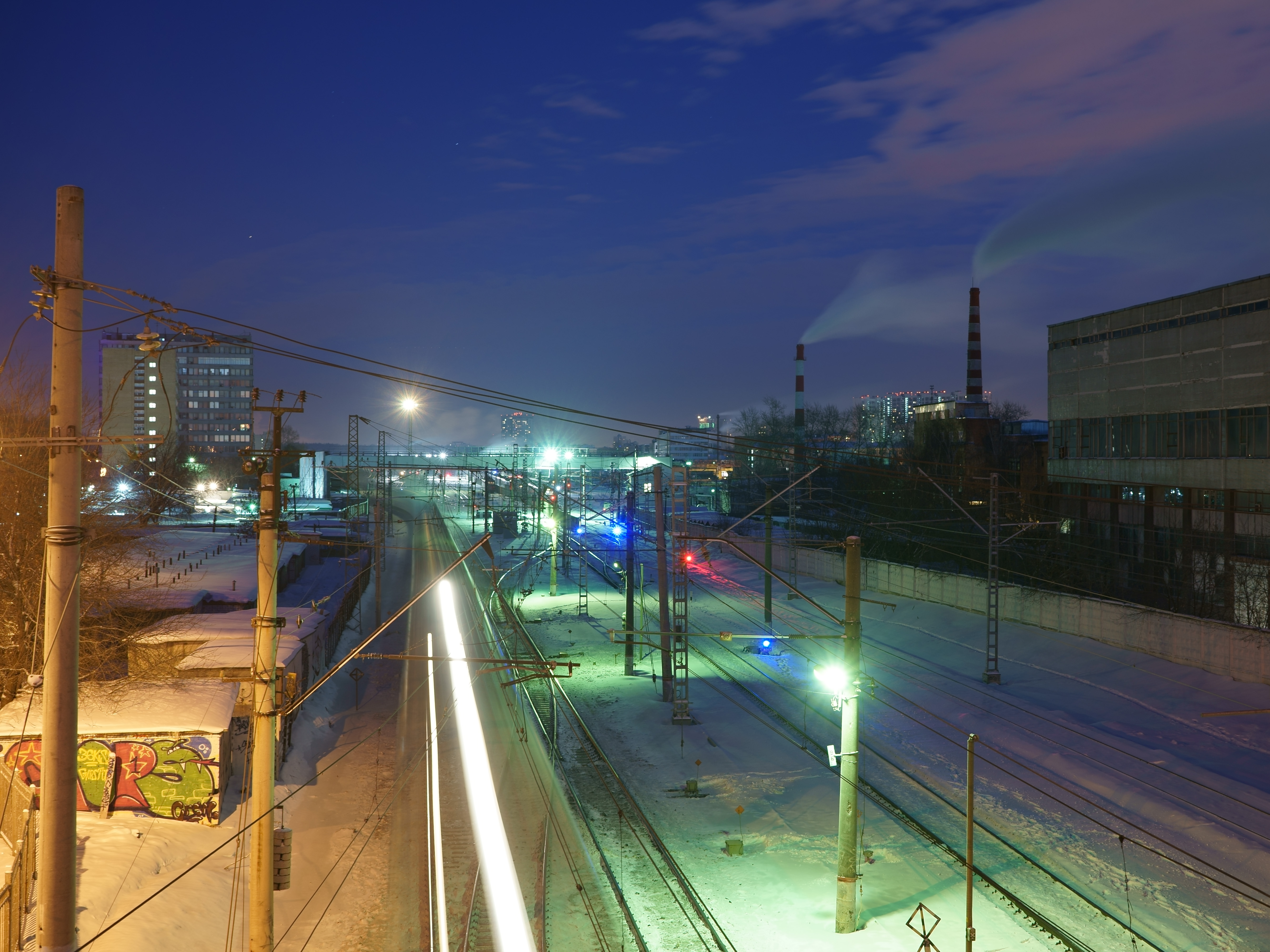 Железная дорога поздним вечером. Использовался штатив. Режим протяжки: автоспуск: 2 сек. ISO100. Диафрагму установил F7.1, Выдержку установила камера 13сек.