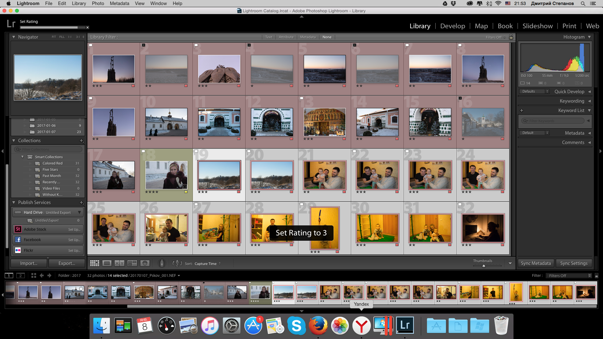 Наше задание посвящено не только цветовым меткам, но расстановке рейтинга звездочками. Часто он бывает важнее, по нему проще сортировать изображения. Вижу, что "звездный" рейтинг у Вас не совсем соотносится с цветовыми метками. К тому же, нет ни одной "пятизвезочной" работы - не будьте к себе столь строги. Смело помечайте пятью звездами лучшие работы (пусть даже они не идеальны).