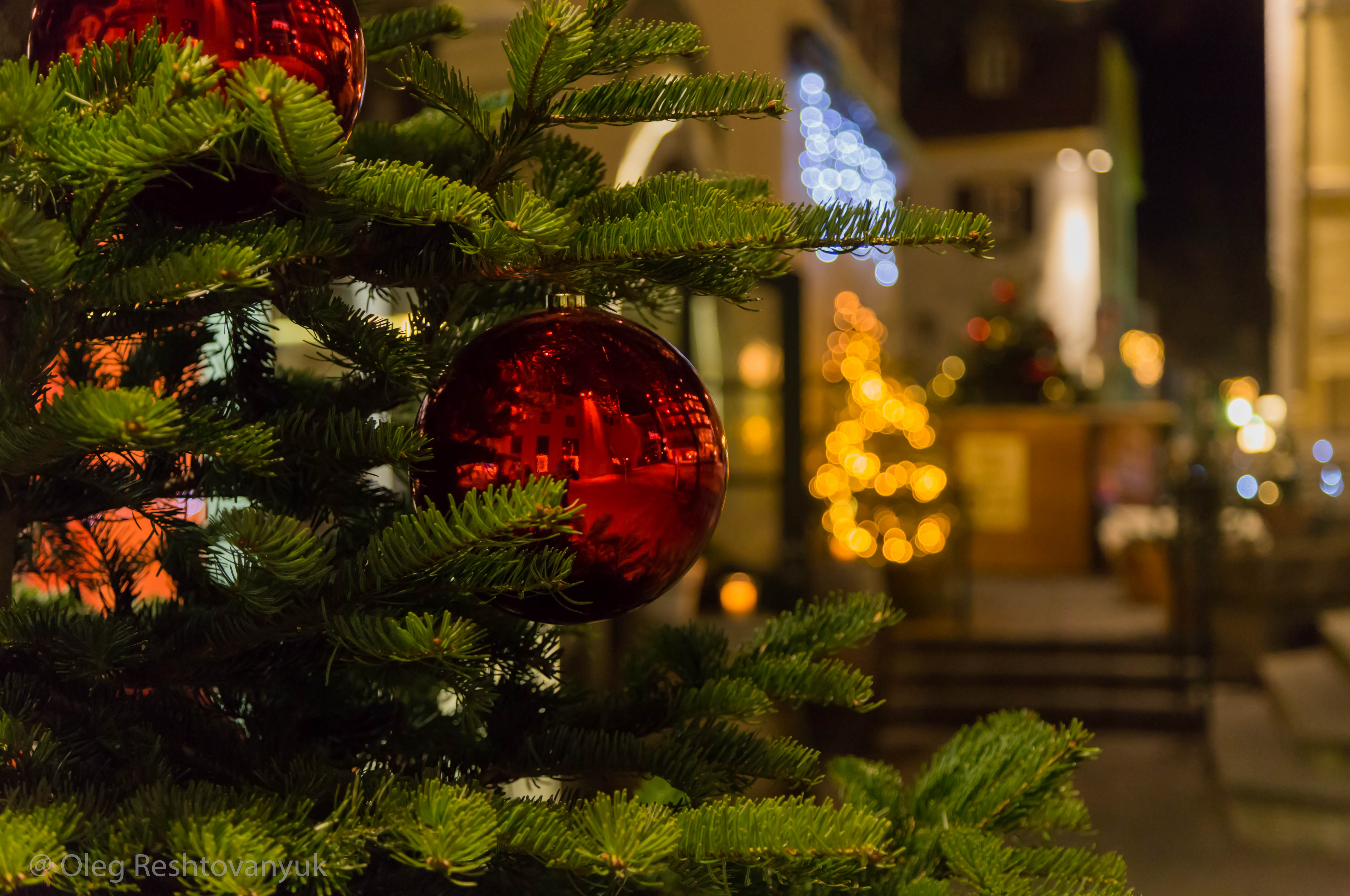 Не вполне уверен, что данный снимок относится к жанру натюрморта, тем не менее главные "действующие лица" на нем - новогодний шар и елка (неодушевленные предметы). Снимок сделан во время вечерней прогулки по вечернему австрийскому городку Бад-Хофгаштайн.