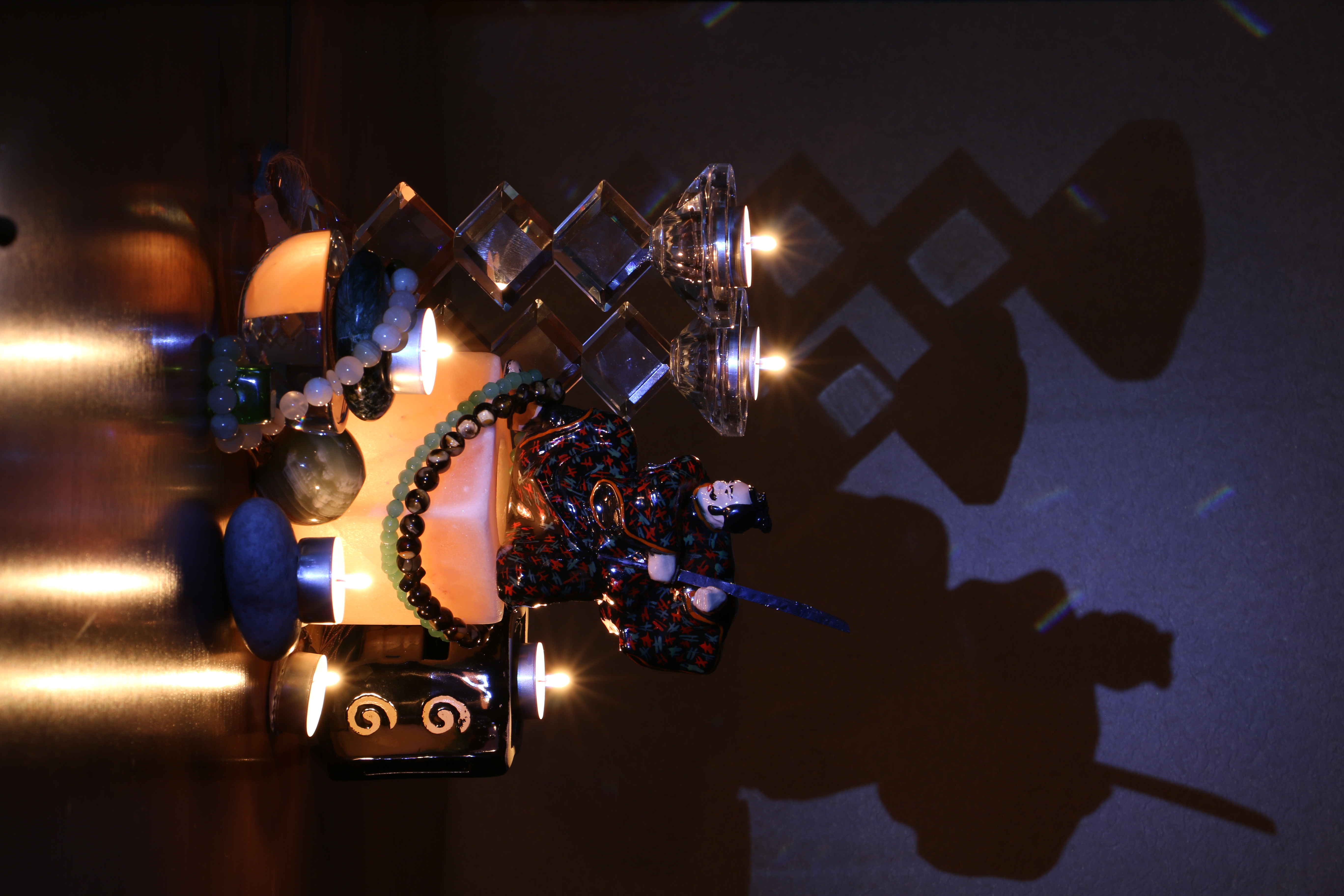 Спасибо за проделанную работу! Очень хорошо, что в этот раз использовали упор и надежно зафиксировали камеру - чёткость снимка отличная, никакого смаза. Графическое качество тоже серьезно возросло за счет использования низкого значения чувствительности ISO. Сфокусировались точно, выбрали верное значение диафрагмы - все важные объекты в зоне резкости. Компоновка снимка более удачная, в нижней части композиции разбавили тени, а дорожки света на столешнице добавили глубины на переднем плане. Тень самурая на стене стала чётче и очень удачно взаимодействует в кадре с тенью от подсвечника. Неплохо!
