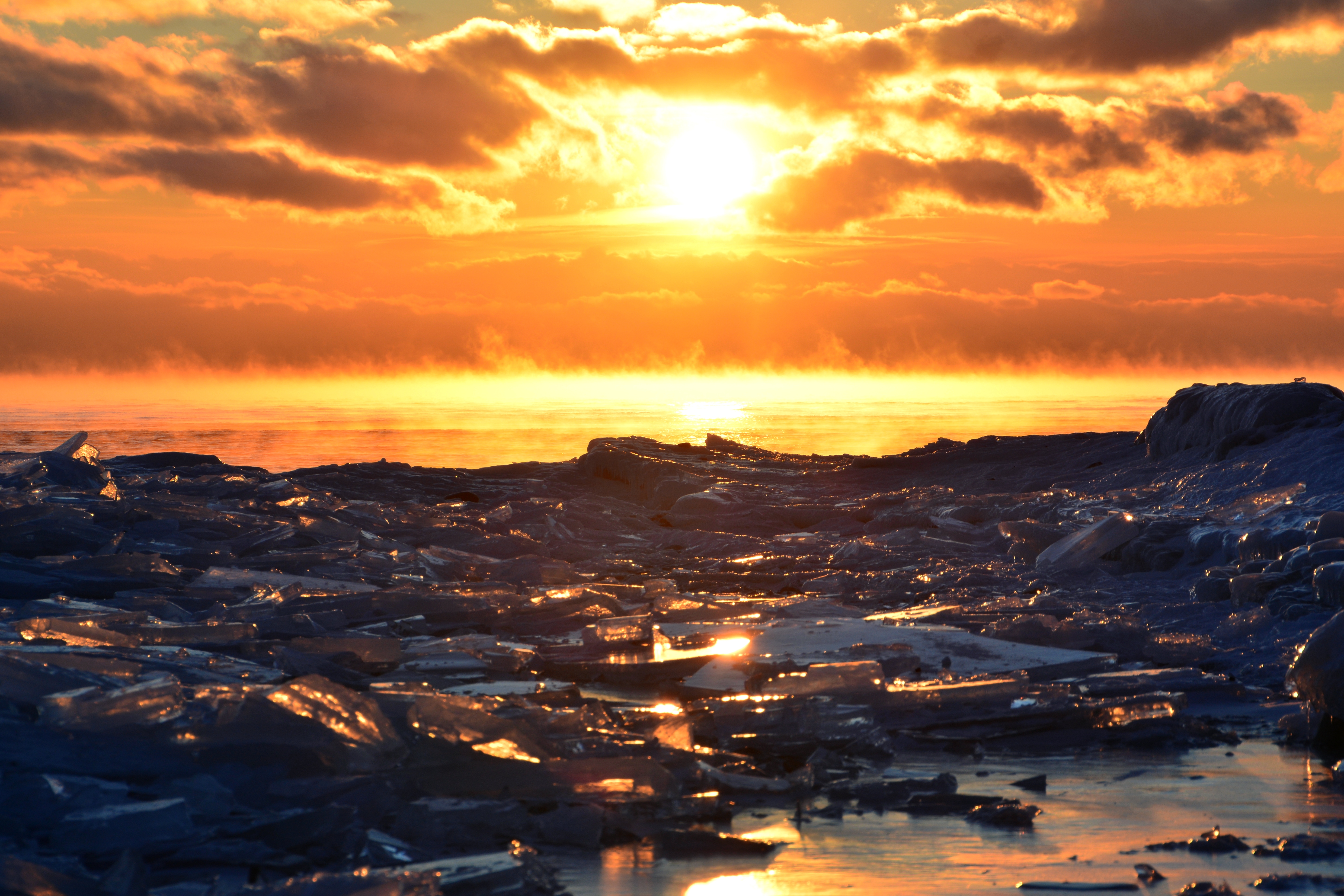 Какой необычный кадр! Очень эффектный сюжет. Тут и закат и лед и пар. Очень красиво показано! Чудесный свет. Как здорово он искрится на льду!