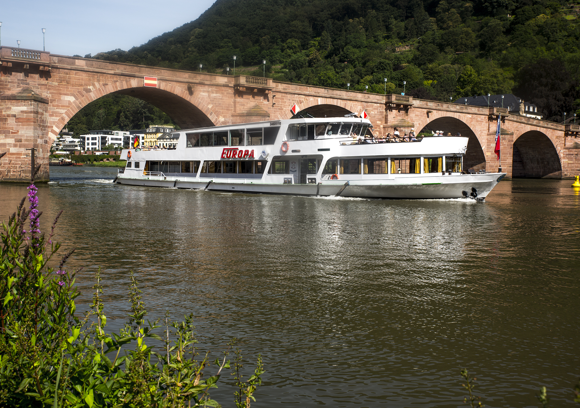 Взгляд свободно перемещается от цветочка в переднем плане к домам за мостом.
