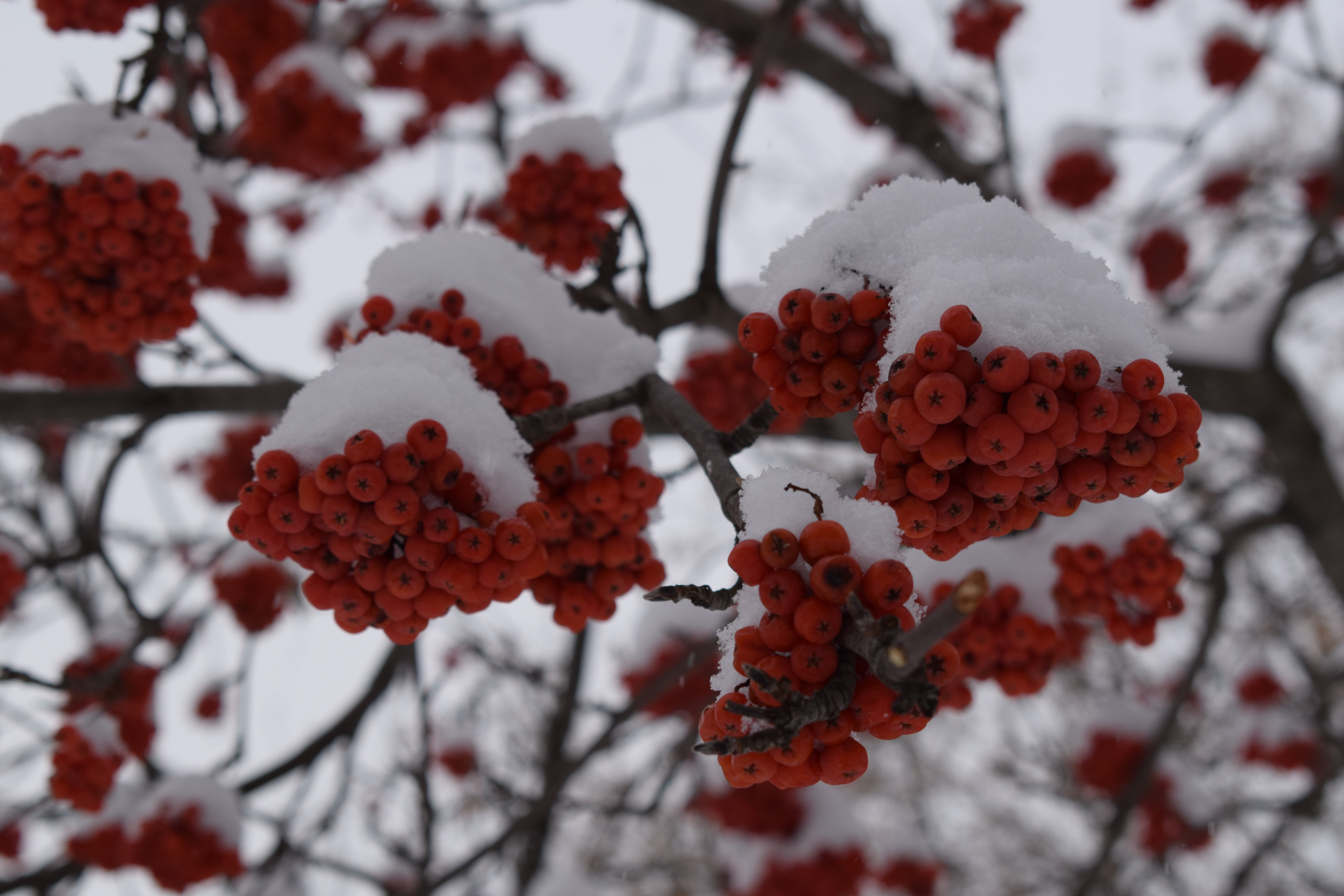 Красные гроздья рябины запорошенные снегом смотрятся эффектно.