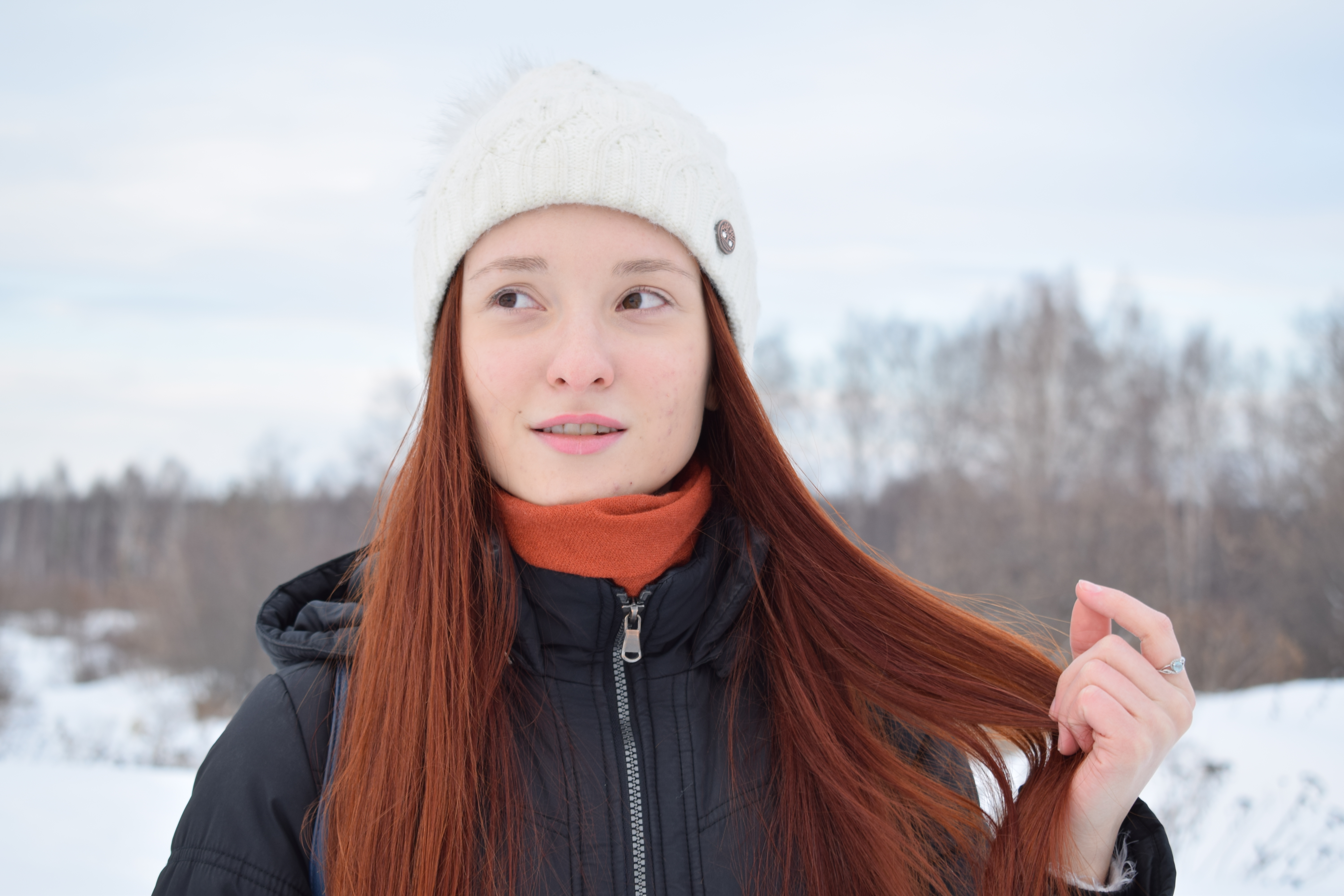 Фото сделано в режиме А на открытой диафрагме (F5,6). Для придания света пасмурному дню добавлена положительная экспокоррекция (+0,7). На наш взгляд, удалось передать задумчивость и мечтательность модели, а также контраст между огненно-рыжими красками девушки и холодными голубоватыми тонами зимнего леса.