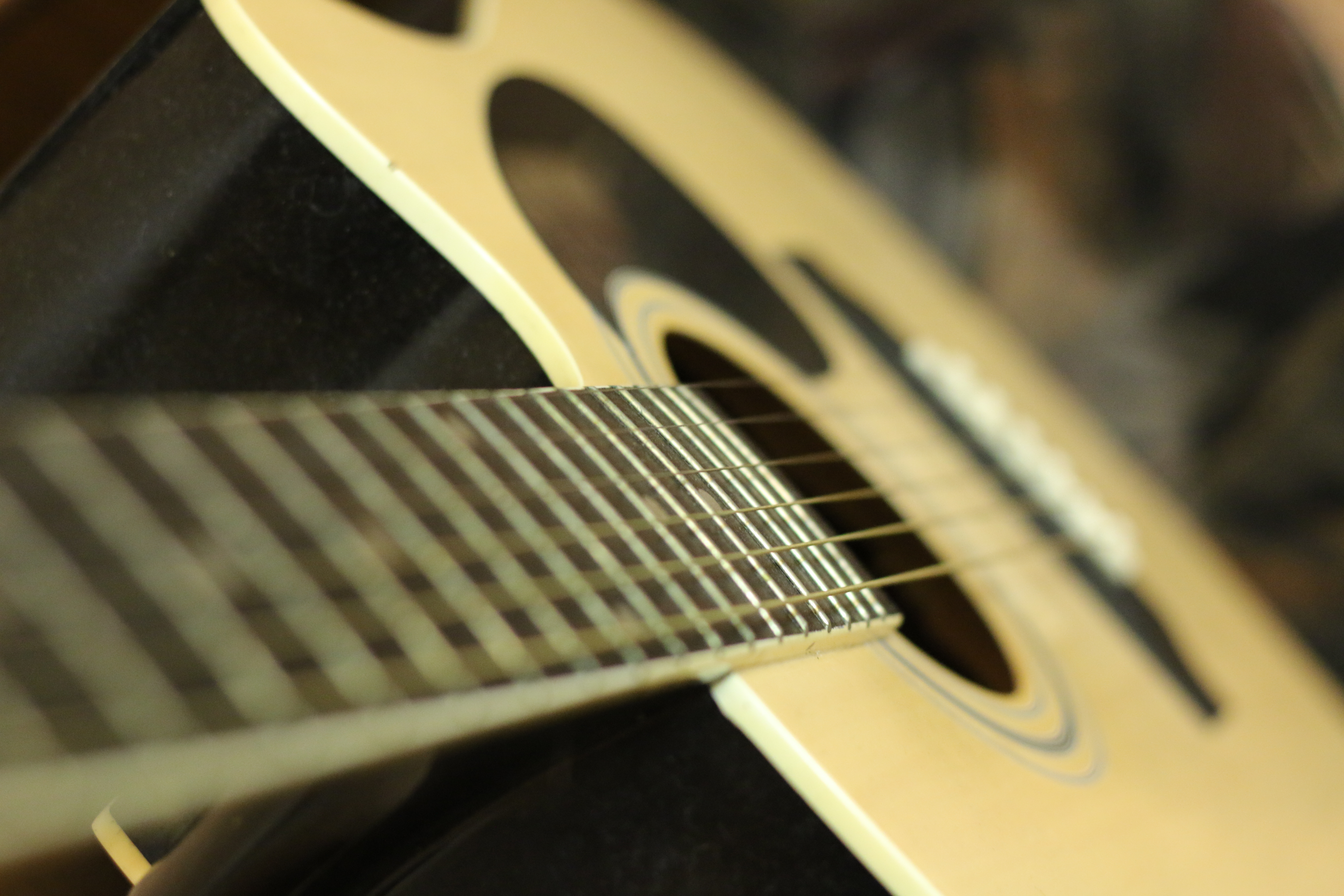 Широкая диафрагма позволила эффектно выделить лишь незначительный участок гитары со струнами.