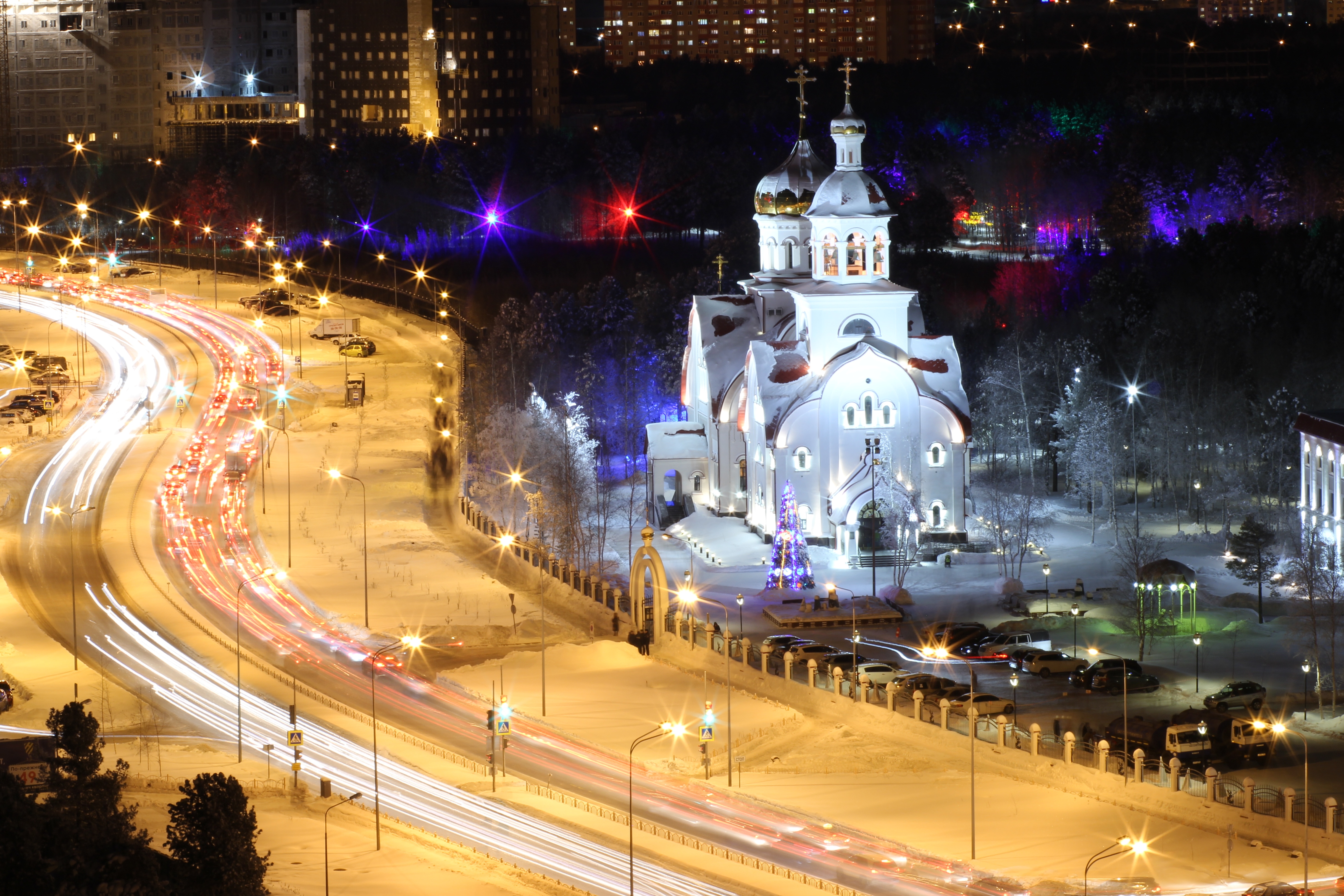 С одной стороны - тёмная зона с белоснежными стенами храма, с другой более светлая дорога, которую рассекают линии света получившиеся от фар автомобилей.