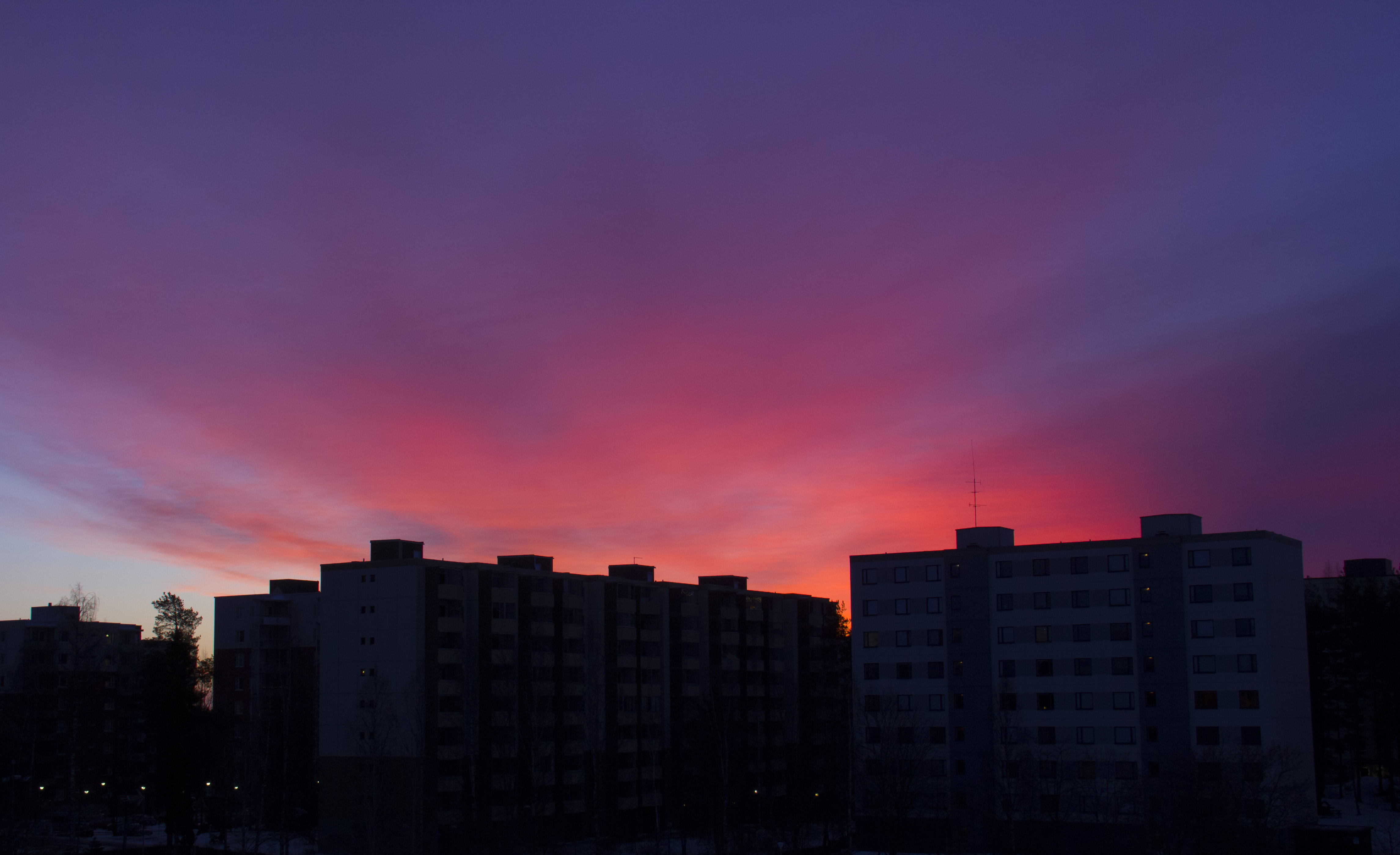 Форма домов читается, что важно при силуэтной съемке. Но если сделать снимок чуть позже, когда окна начнут зажигаться, то снимок будет смотреться объемнее, так как лучше будет читаться форма зданий. Не факт, конечно, что небо было бы еще таким же выразительным, это просто как рекомендация на будущее :)