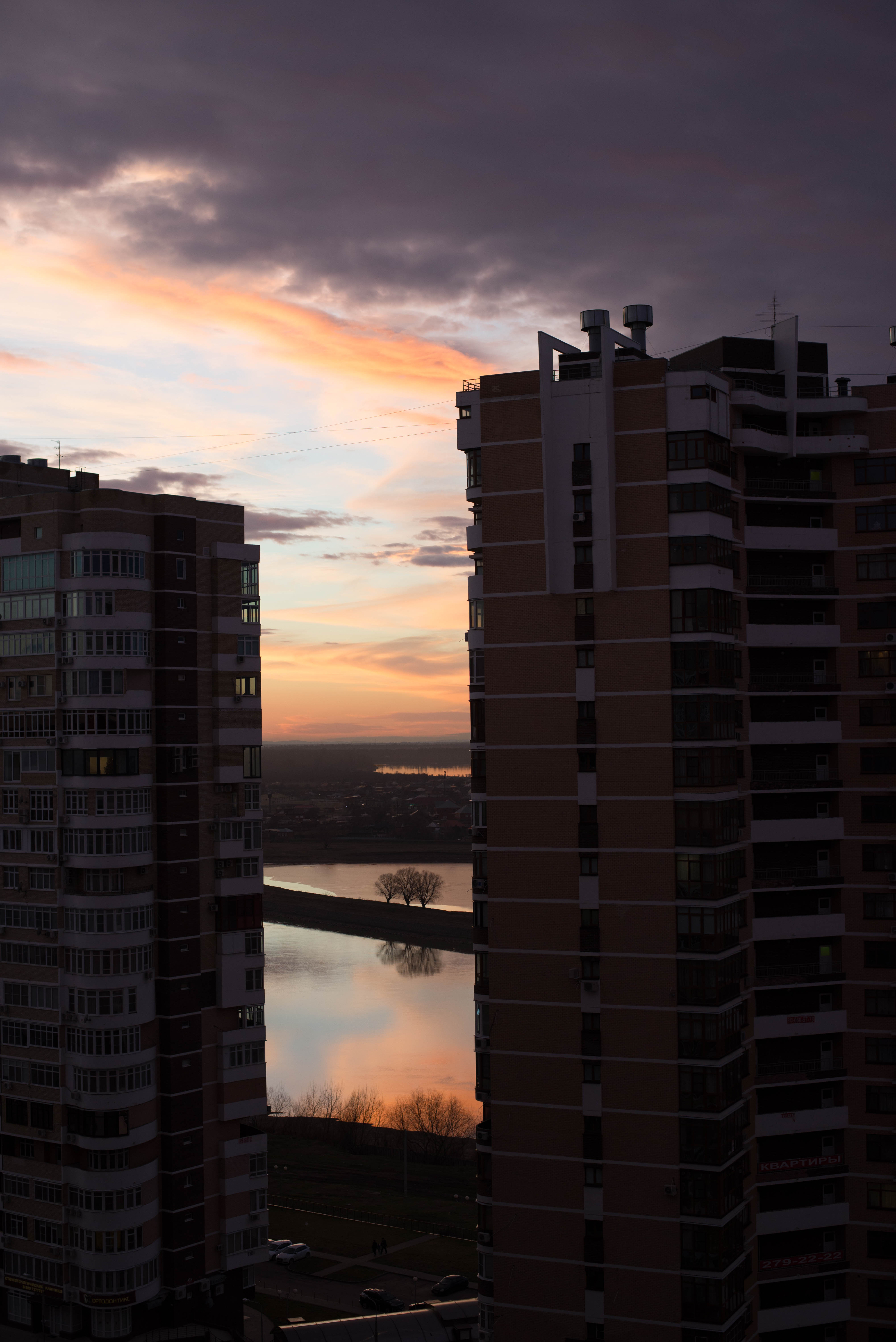 Красивый закатный кадр! Интересный сюжет с домами на переднем плане. Красивые краски вдали.