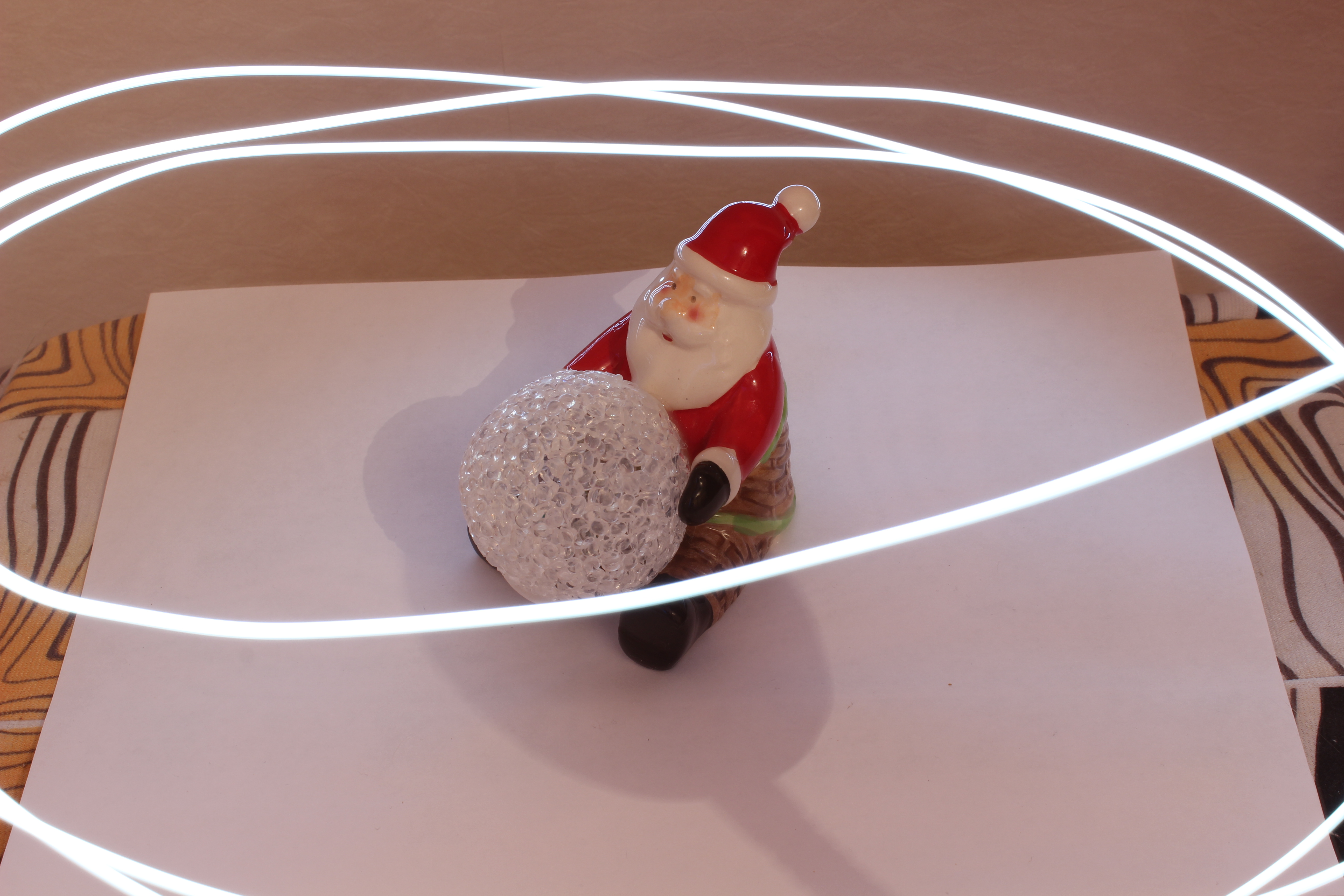 Пробовал сделать работу как в примере к одному из уроков курса. Выдержку выставил на 5 секунд. Чтобы можно было успеть нарисовать фонариком круг. Фонарик использовал от самого простого телефона. Диафрагма была выставлена на 13 в связи с тем чтобы была возможность показать и дуги и фигурку в фокусе. ISO было выставлено на 100 т.к. не хотелось получить шума от большего значения.
