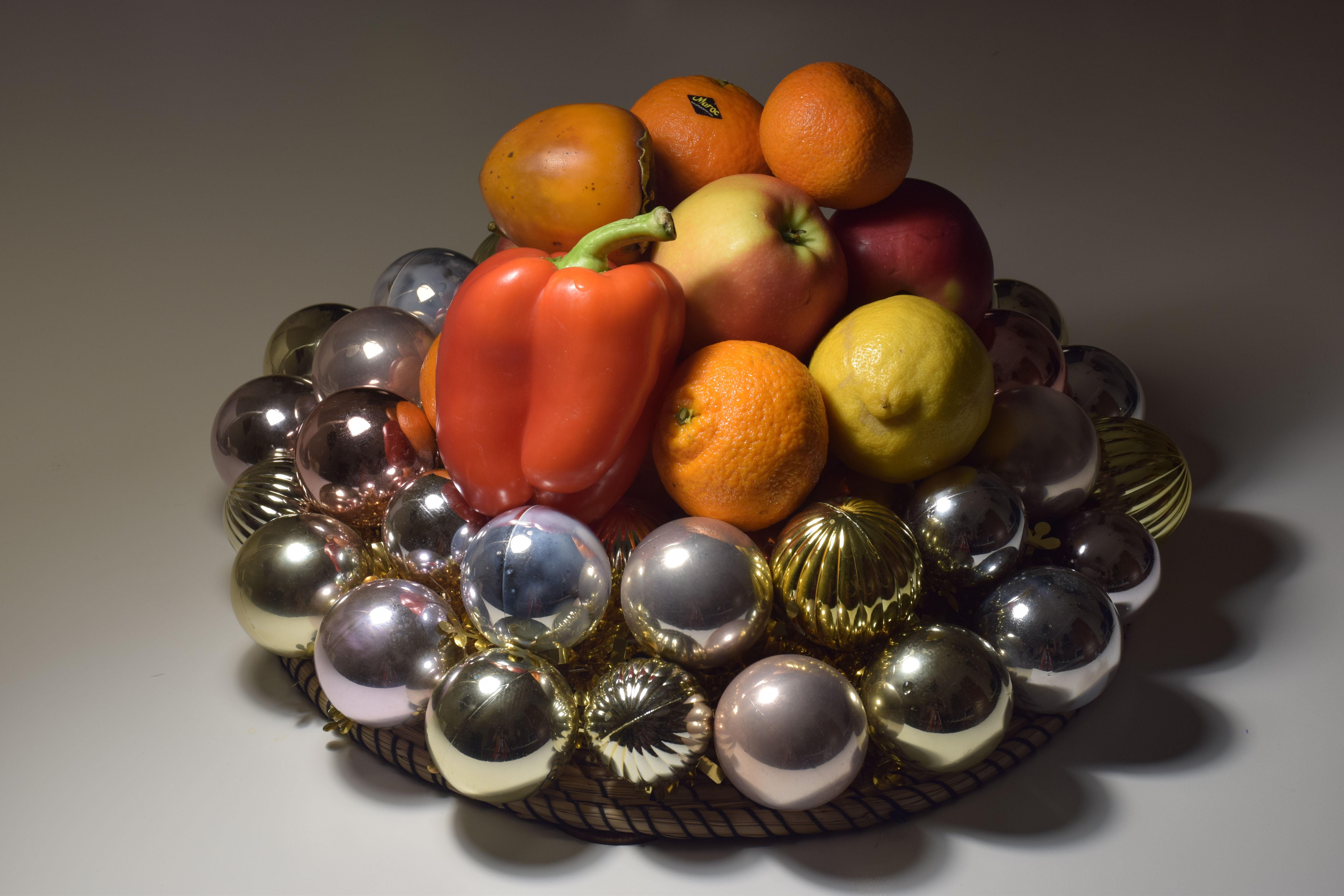 Доброго дня суток! Решил сегодня сделать натюрморт! Ну подумал задание вроде не сложное))) Нет для меня не простое ... корзинки тазики и т.д. я видел искал долго и тут СПАСИБО ТЕБЕ ИКЕЯ! На стене у дочки нашел елочный натюрморт. А вот дальше сложность была в выкладке красиво или приемлемо для глаза овощей и фруктов, и выставление наиболее подходящего угла падения света. Пробовал на открытой диафрагме ... но в итоге закрыл диафрагму. Итак ISO100 диафрагма f11 штатив и длинная выдержка. Свет лампа с матовым просвечивающим белым плафоном 60Вт. Отсутствие студии сказывается в отражениях нашей кухни на поверхностях шариков. Себя со штативом кое как прикрыл черным креслом. Итак Жду Ваших ощущений и оценок. Заранее признателен!