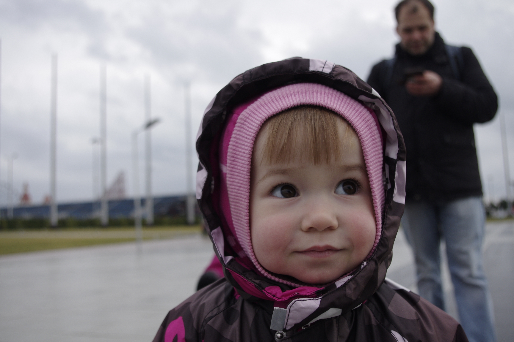 Выглядывающий розовый капюшон создаёт отличный цветовой акцент. С резкостью всё в порядке. Рассеянный свет отлично проработал детали.