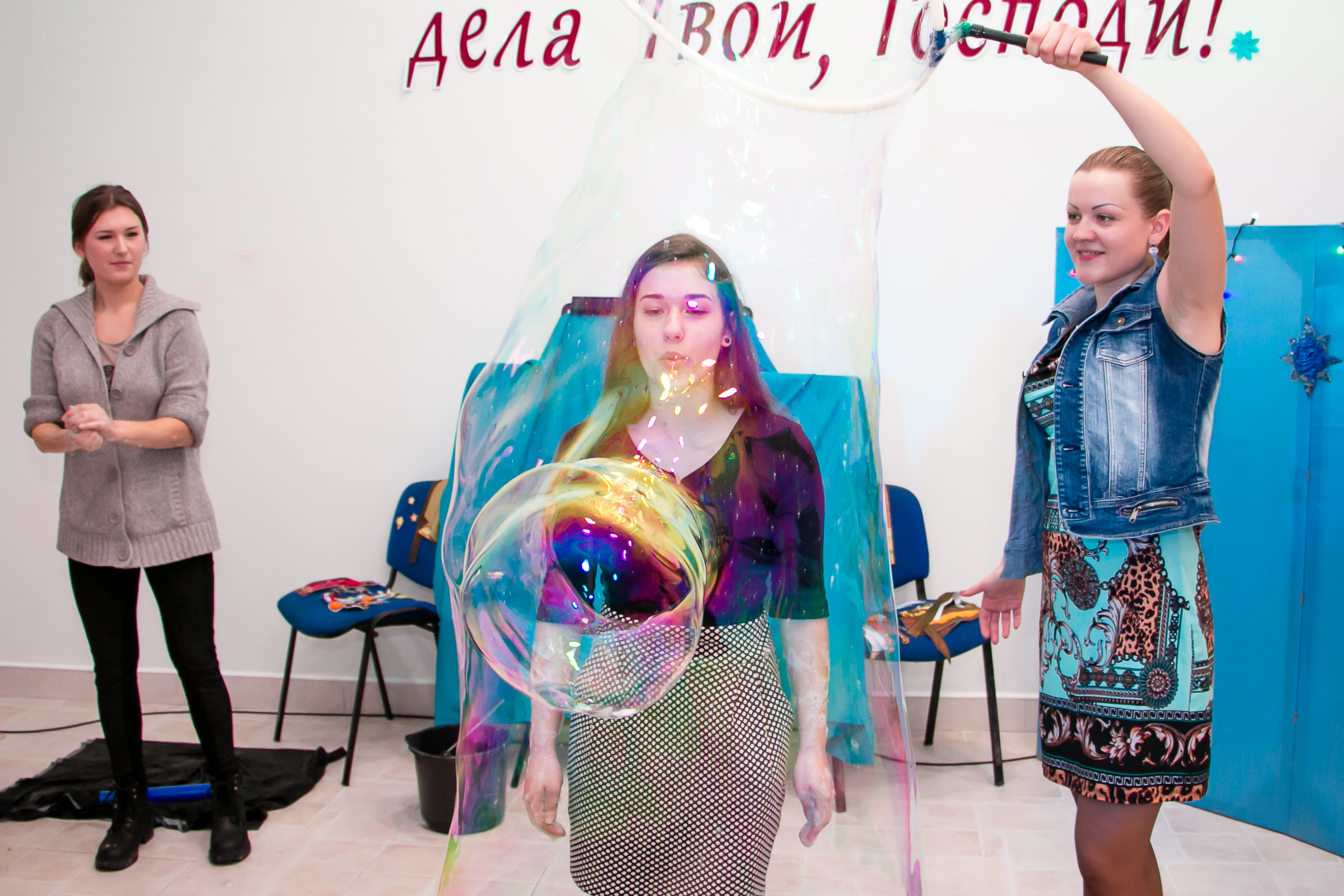 Про сочетание надписи с происходящим я согласен. Думал убрать в редакторе, но это была часть детской Рождественской программы, в которое включено не только шоу мыльных пузырей.
