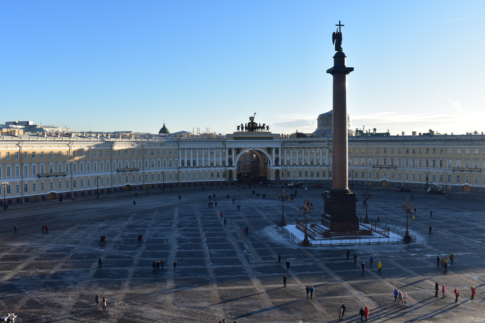 В первую очередь, хочется отметить удачно выбранную точку съёмки, позволившую показать площадь как на ладони. Стеллу разместили в композиционно выгодном месте на линии третей. Люди в кадре оживляют сюжет и позволяют зрителю соотнести масштаб. Яркий солнечный день и голубое небо в кадре - придают сюжету позитивные нотки.
