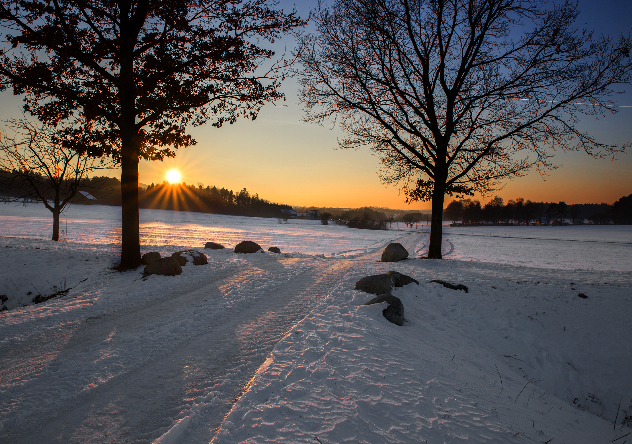 Прекрасно передана перспектива и ощущение пространства, линии дороги образуют удачные визуальные направляющие от переднего плана к дальнему, солнце создаёт мощный зрительный акцент за счёт яркости и цвета, также красиво смотрятся солнечные лучики.