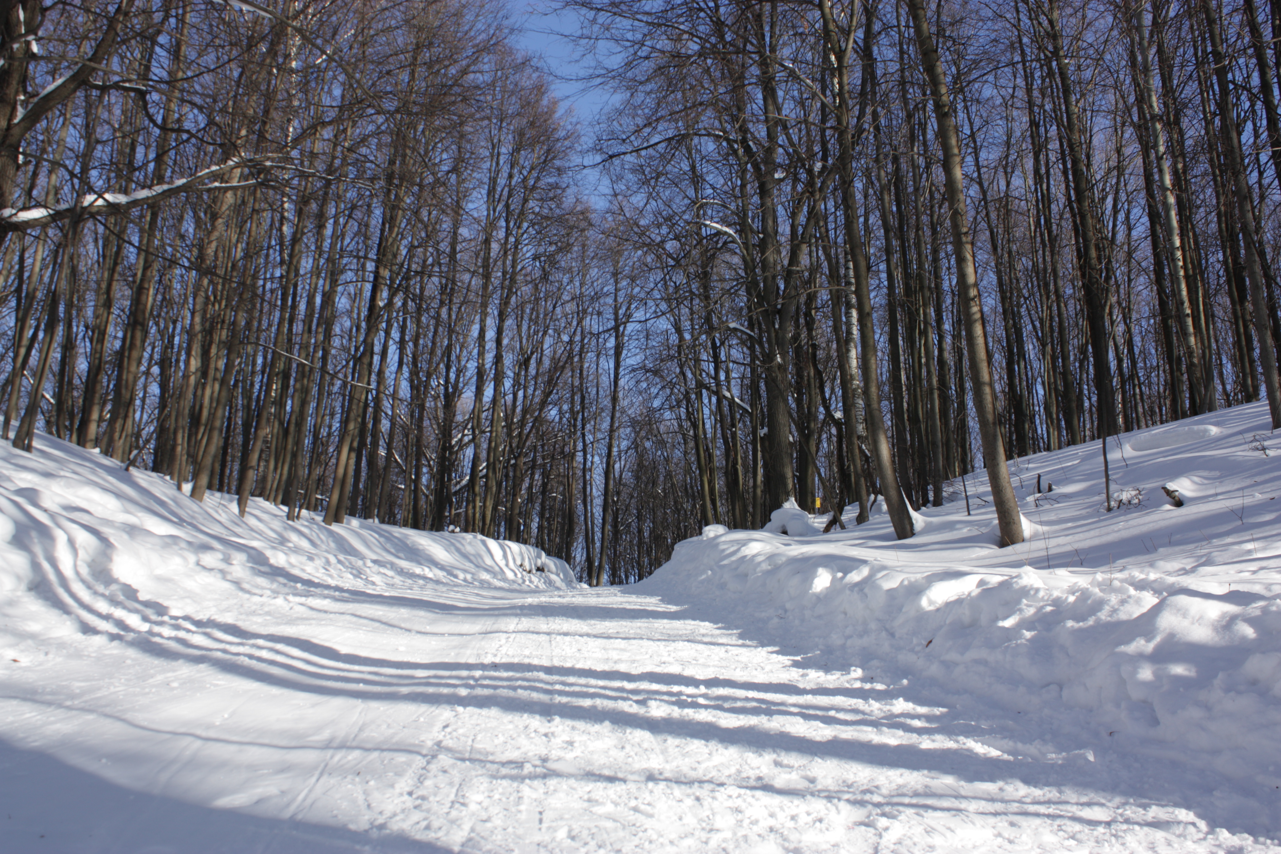 Зимняя лыжная дорога в лесу. Дорога уходит круто вверх. Хотелось передать крутизну и скорость. Не понятно где в пейзажах ставить точку фокуса? Ставил в месте схождения дороги.