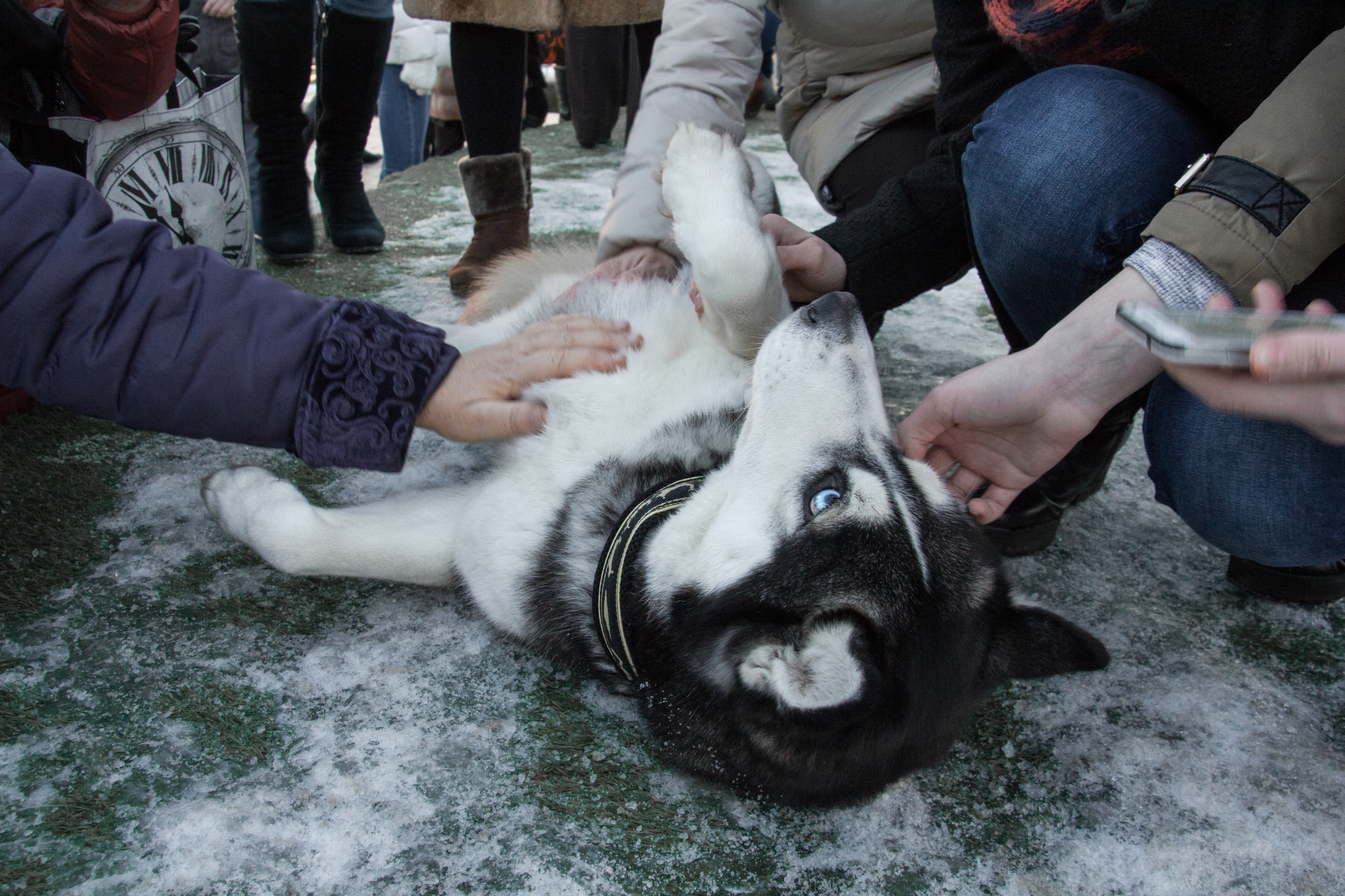 Фестиваль "Хаски на крыше" в лофте "Этажи", Санкт-Петербург. Немножко вела экспозицию в плюс, добавила контраста и четкости. Убрала немного синий и красный, чтобы яркие элементы одеды людей не отвлекали внимания от главного героя. И чуть-чуть убрала шумы (было темновато и пришлось завысить исо)