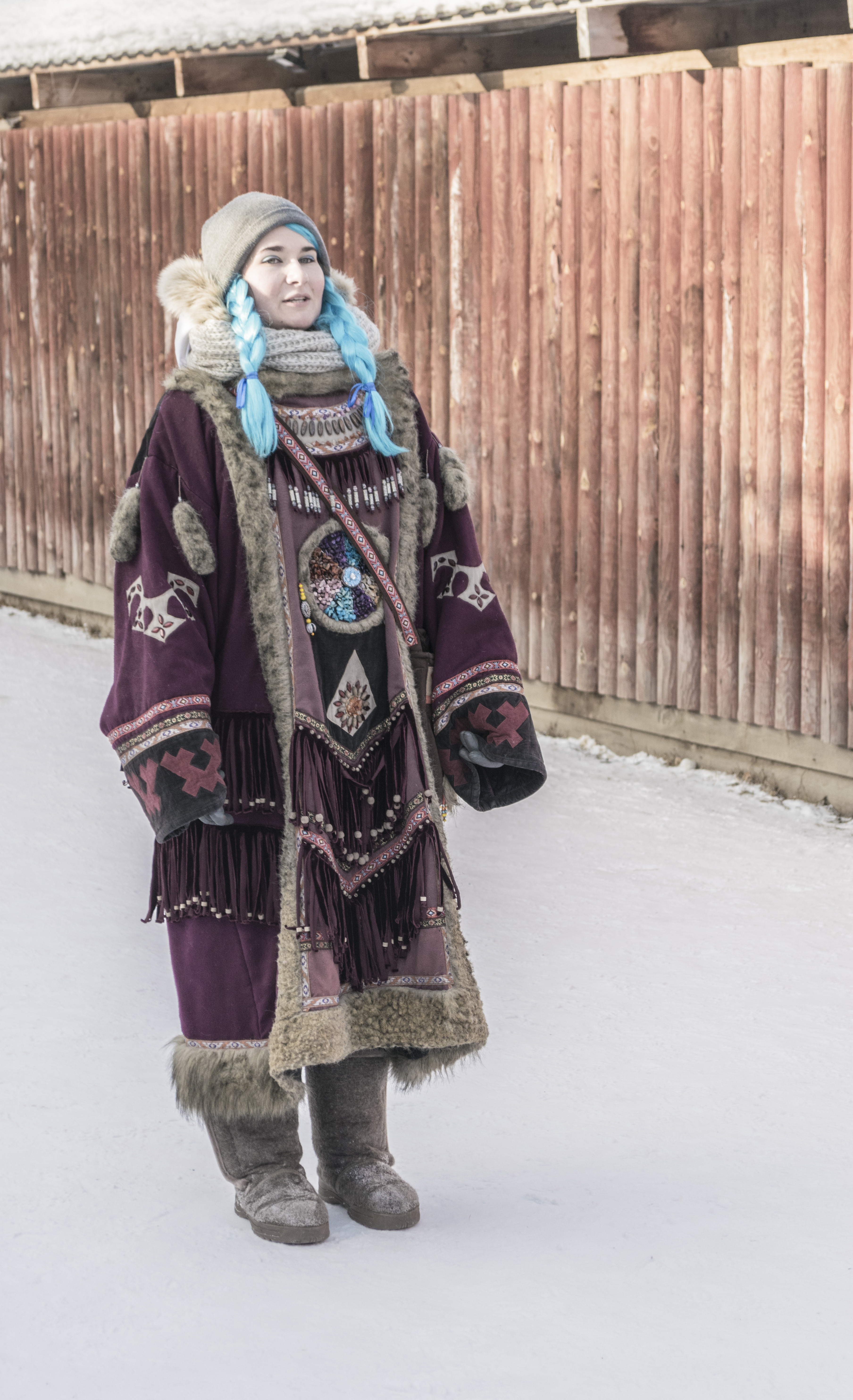 Фотография в жанре портрета. Модель в национальном наряде на однородном фоне.