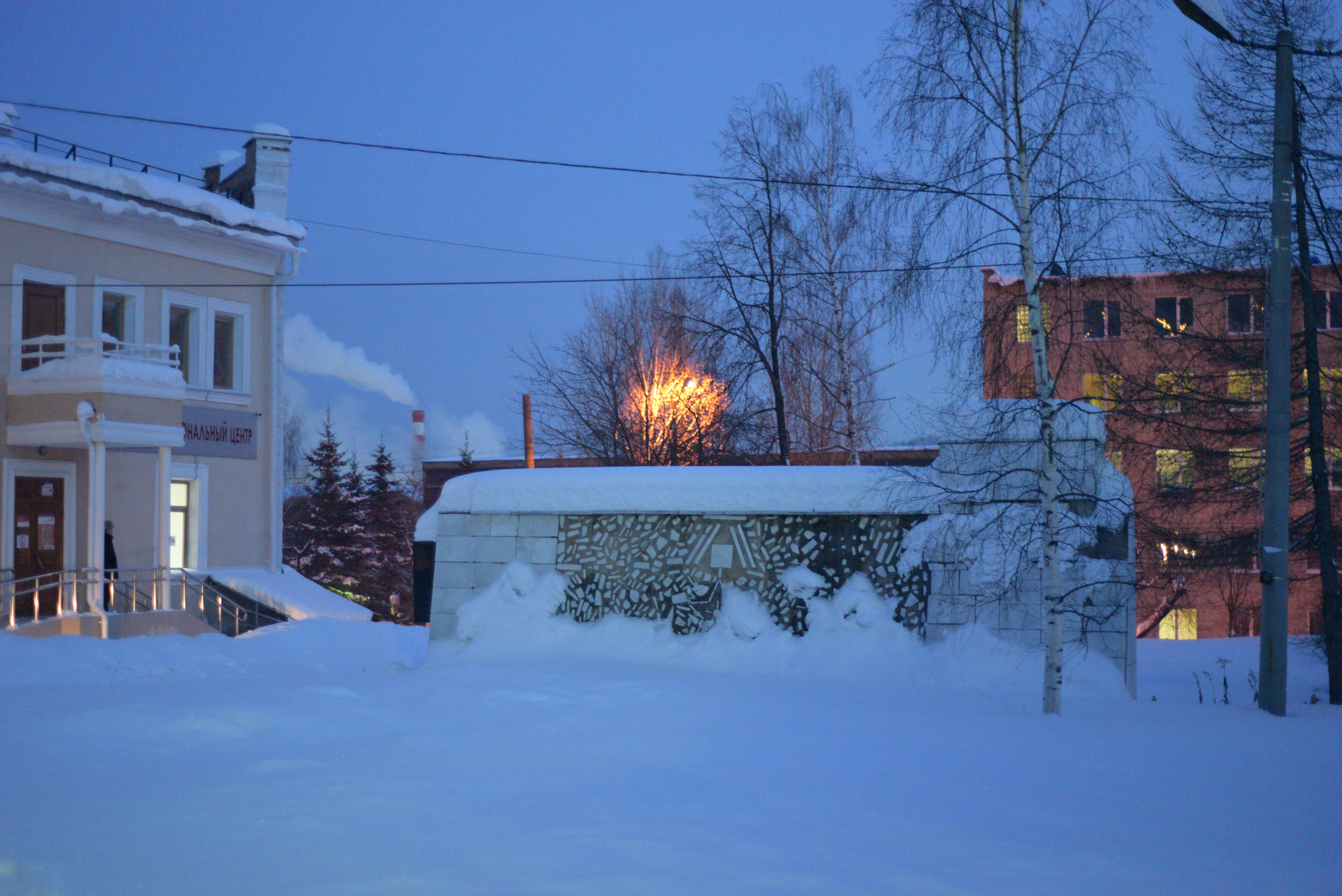 Симпатичный вечерний кадр получился! Настроение хорошо передано за счет цветового контраста- теплого цвета фонарей и холодного неба, снега.