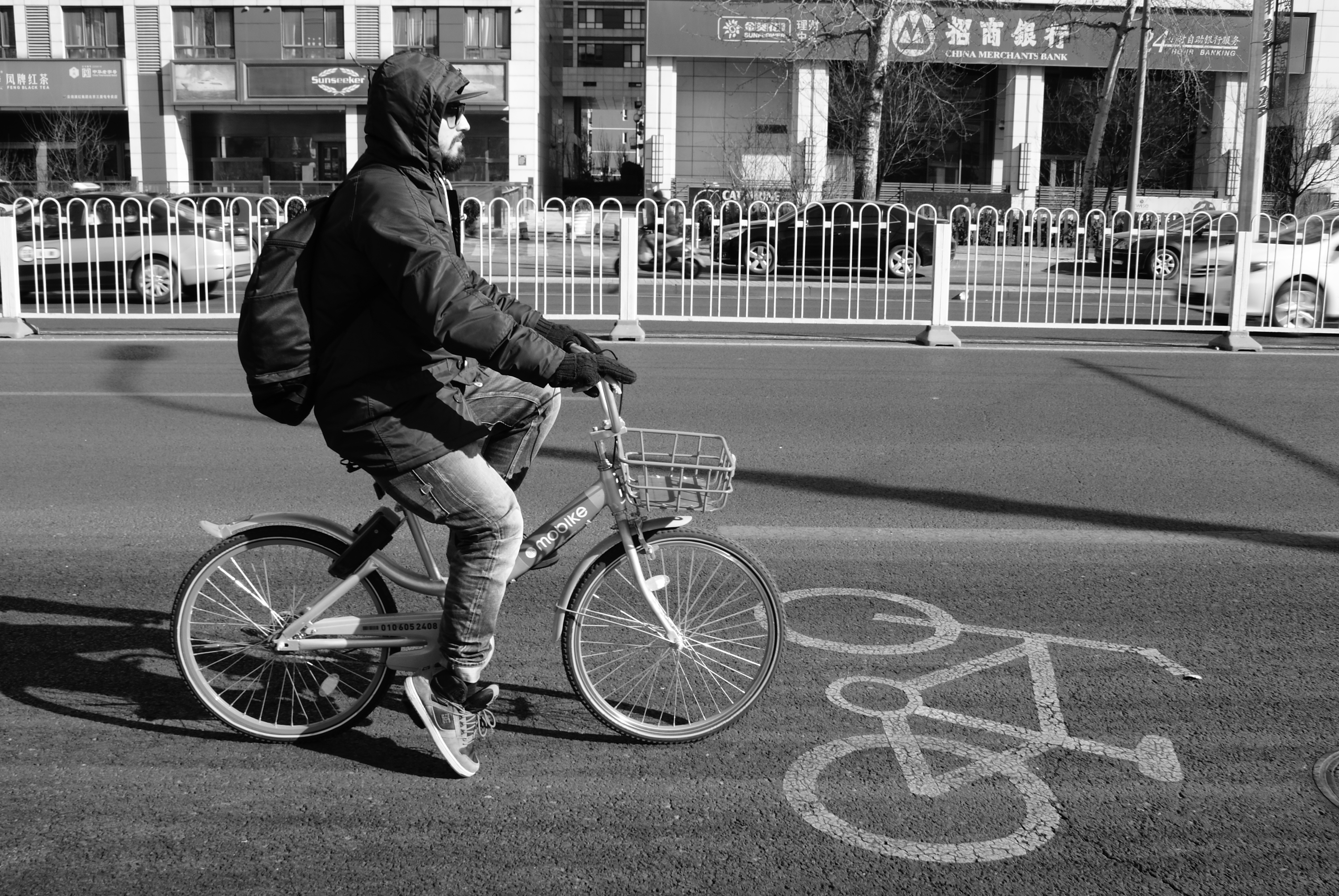 После прохождения первого урока я не ставила для себя задачей выбрать конкретную тему домашнего задания, я решила что буду действовать по ситуации, взяла камеру и вышла на улицу. Сделав множество фотографий на разные темы я остановилась на черно белой съёмке. На данном фото центральной фигурой является молодой человек на велосипеде, машины на заднем фоне слегка размыты что показывает движение в кадре, хотя главная фигура стоит на месте, возможно только трогается, так как нога ещё на земле. Фотография бы не цепляла меня так если бы на дороге не было знака велосипедной дорожки, мне очень понравилась шероховатость дороги и то как контрастируют цвета.