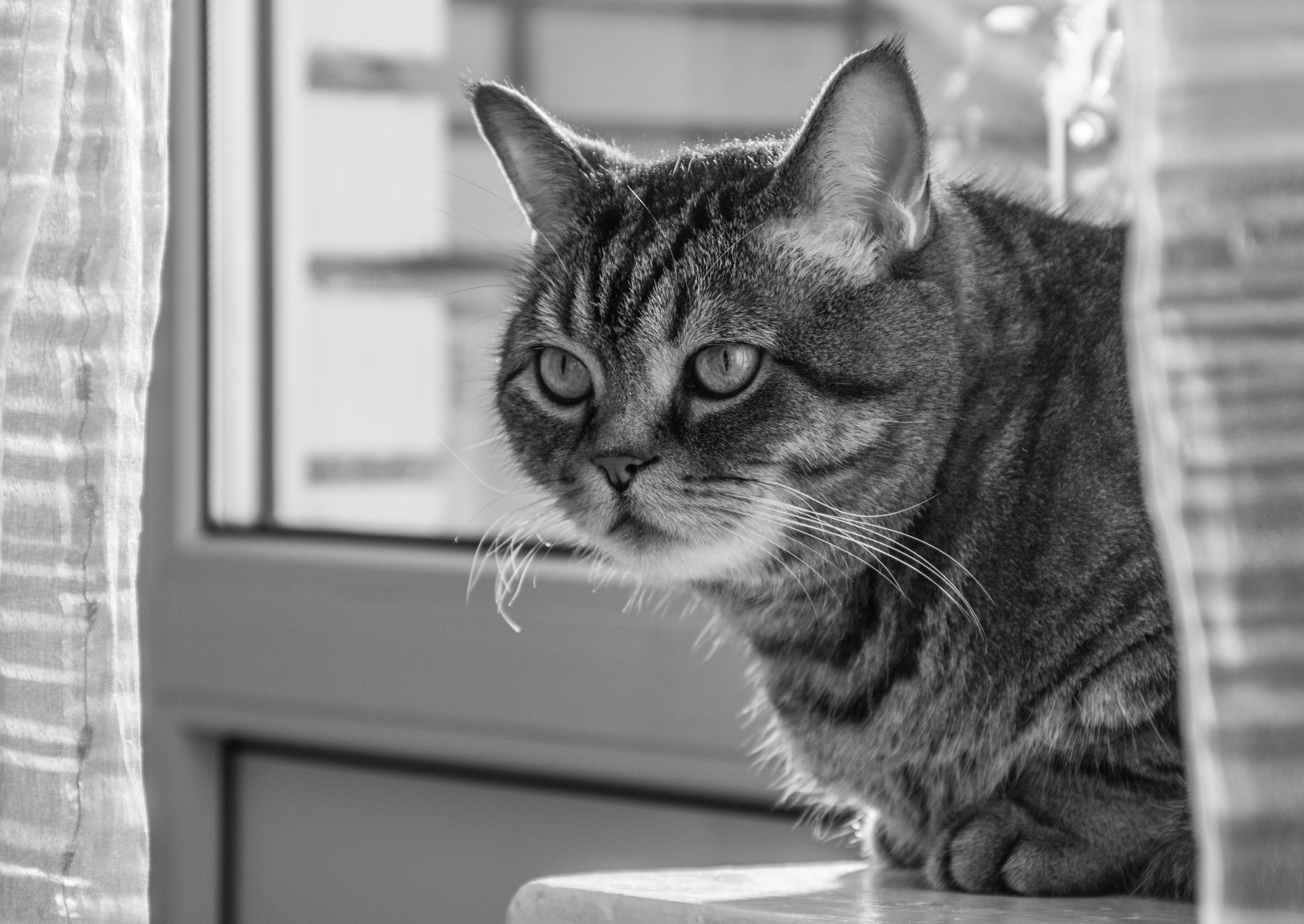 Симпатичный снимок получился! Мне нравится черно-белая подача сюжета, она сделала композицию более лаконичной, устранила цветные ненужные детали. Высокий контраст выгодно подчеркивает полосатый окрас котика.