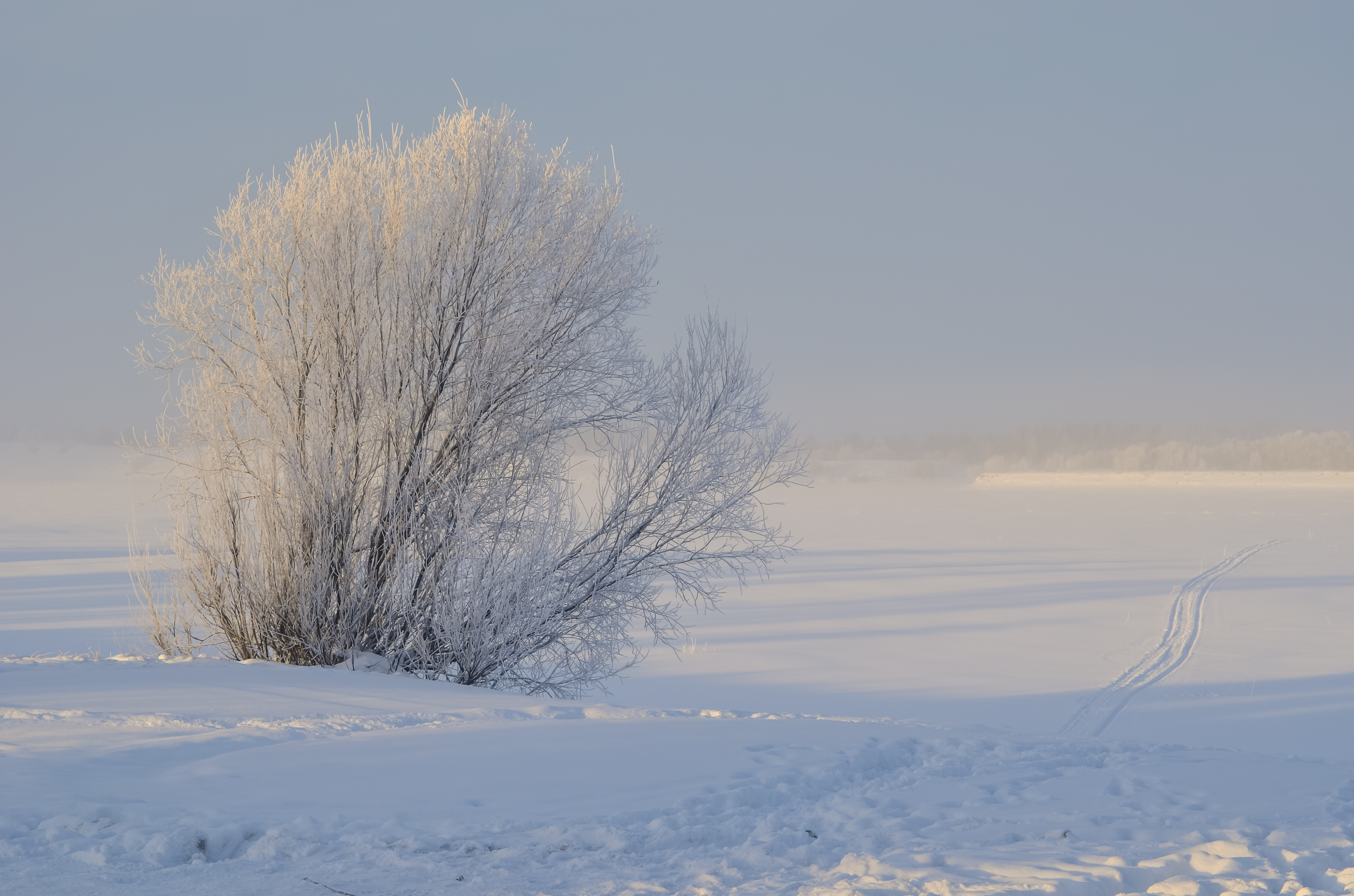 Компоновка кадра хорошая. Действительно, куст хорошо уравновешен лыжнёй. Кроме того, лыжня подчеркнула линейную перспективу на фото. А дымка на фото подчеркнула воздушную (тональную) перспективу.