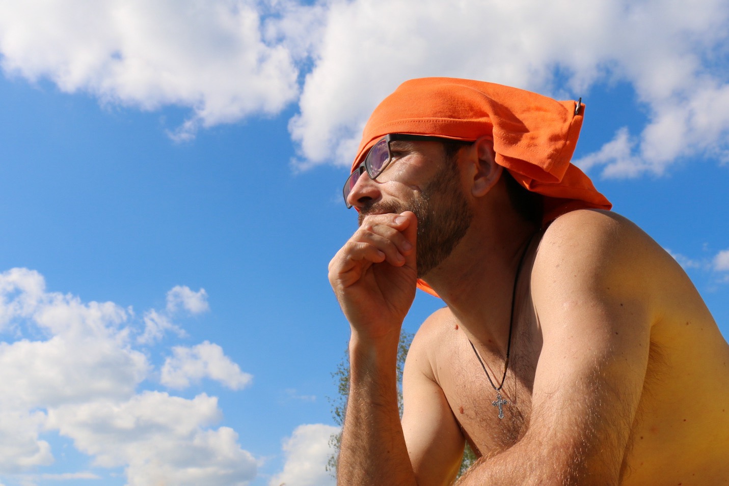 Приятный портрет у Вас получился. Правильно сделали, что при компоновке сместили мужчину от центра, оставив больше пространства по направлению взгляда. Удачно расположили модель по свету. Благодаря этому удалось избежать неправильных теней. Руки смотрятся вполне органично. Оранжевая тряпочка создаёт сильный цветовой акцент.