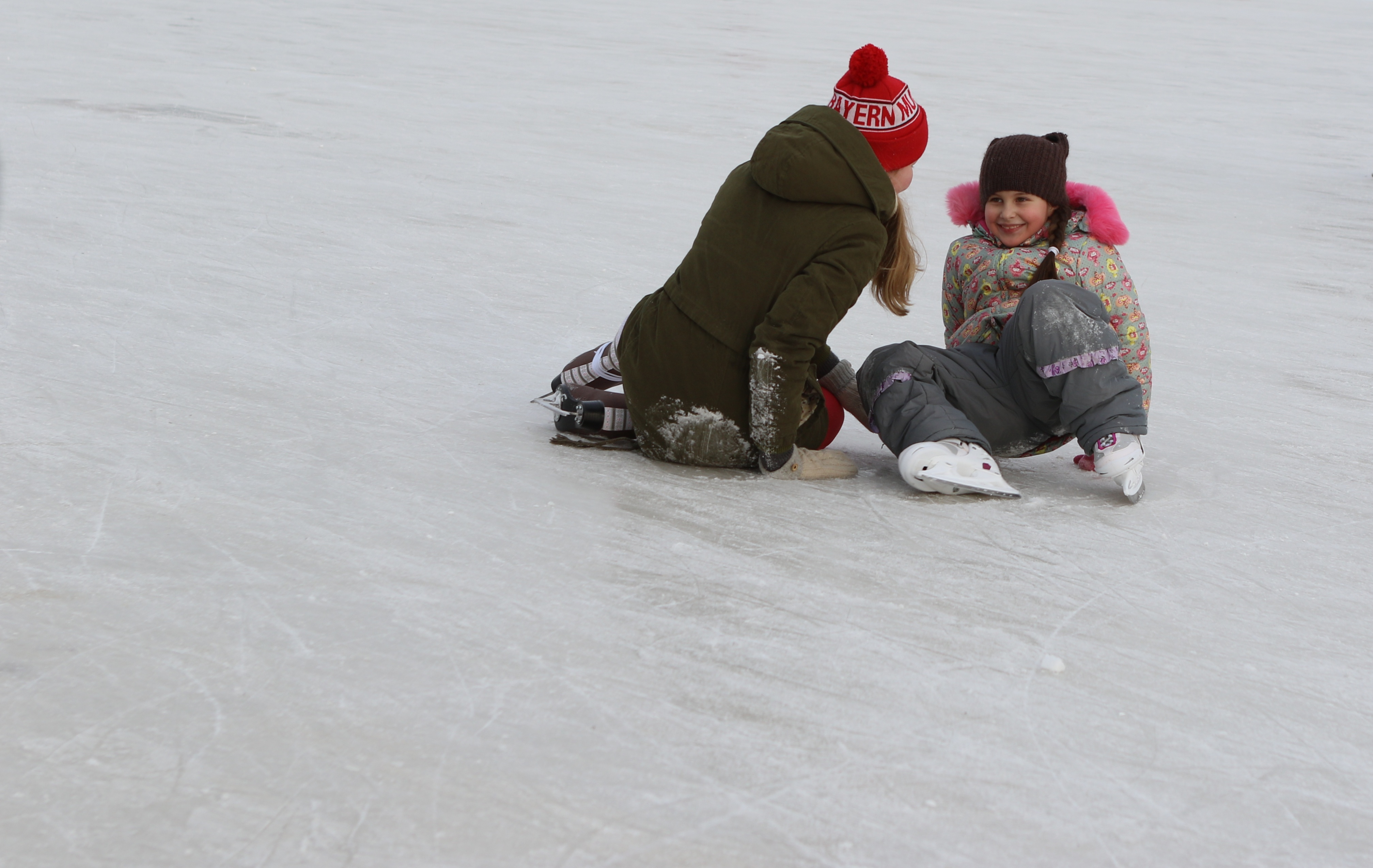 Здоровский кадр у Вас получился. Видно, что не постановочный, снят репортажно. Оправдано смотрится и смещение девочек в верхний угол, и завал горизонта. Это создаёт ощущение неустойчивости, отсутствия равновесия, из-за которого люди и падают во время катания на коньках. Взгляд отлично поймали.