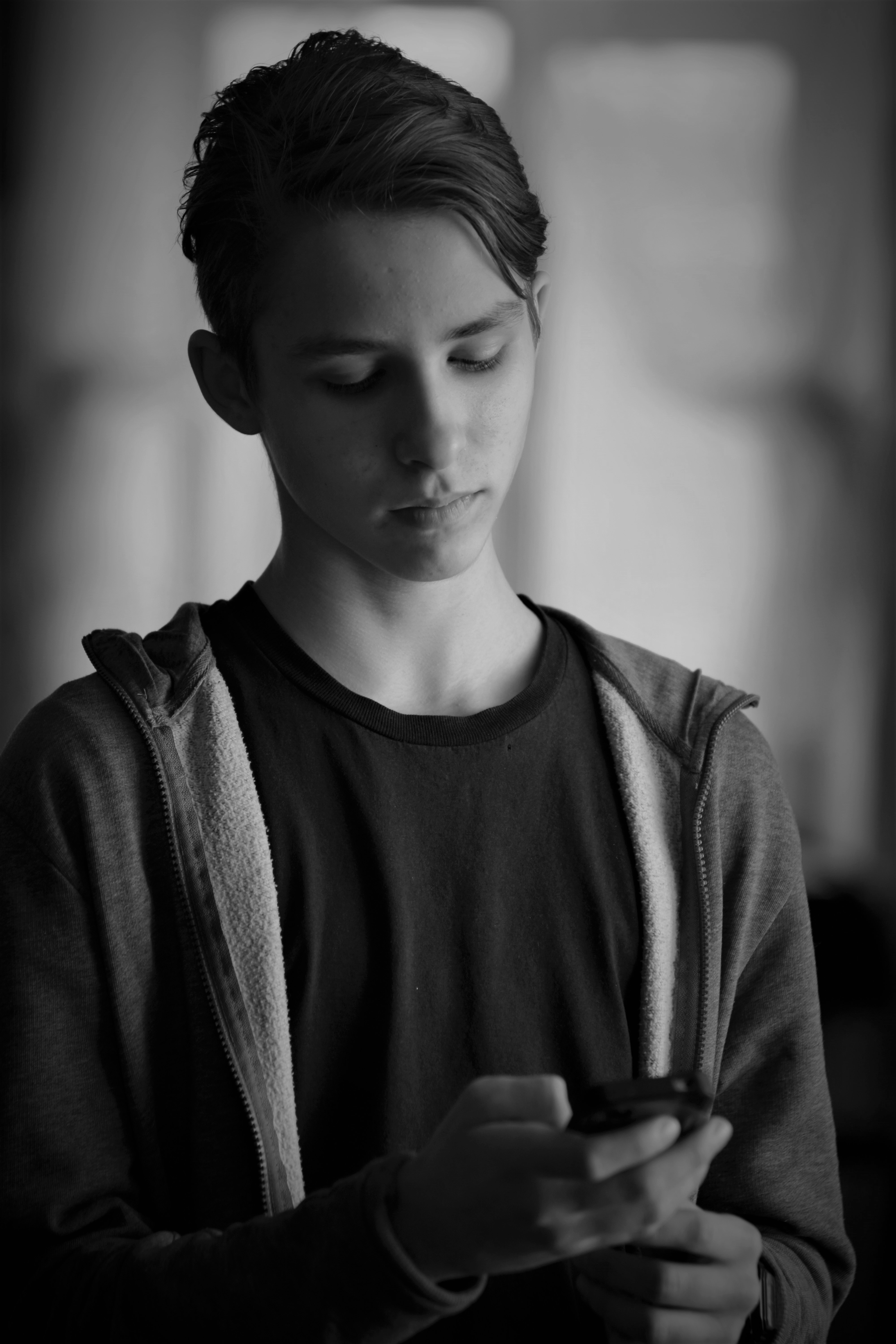 Окно на фоне и справа. Стены помещения - синие, за окном красная кирпичная стена... Пришлось переводить в ЧБ. Этому пареньку (на фото) на самом деле пришла СМС, тут то я его и подловил.