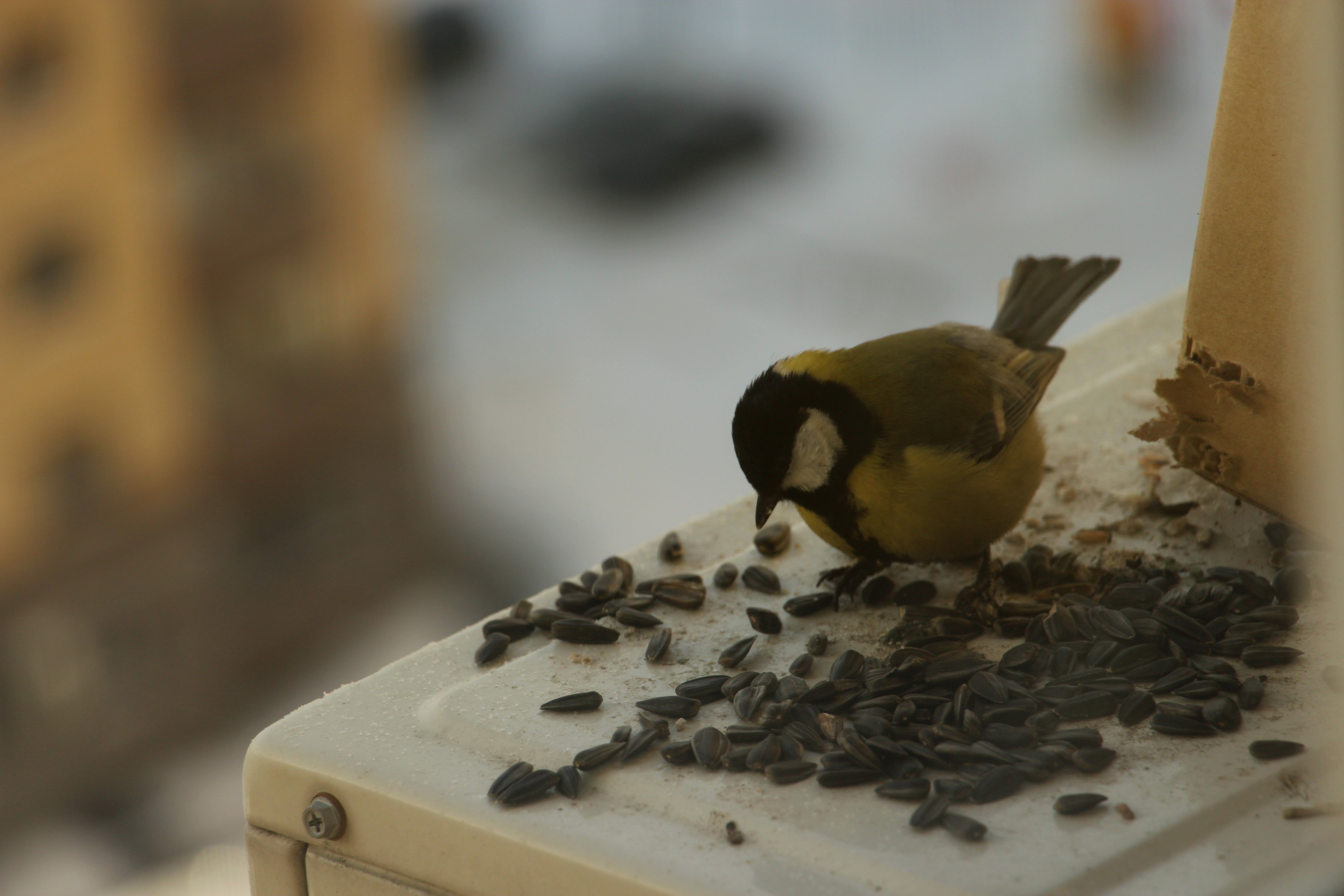 Использовано длинное фокусное расстояние объектива и приоткрытая диафрагма, это способствует уменьшению глубины резкости, синичка выделяется на размытом фоне.