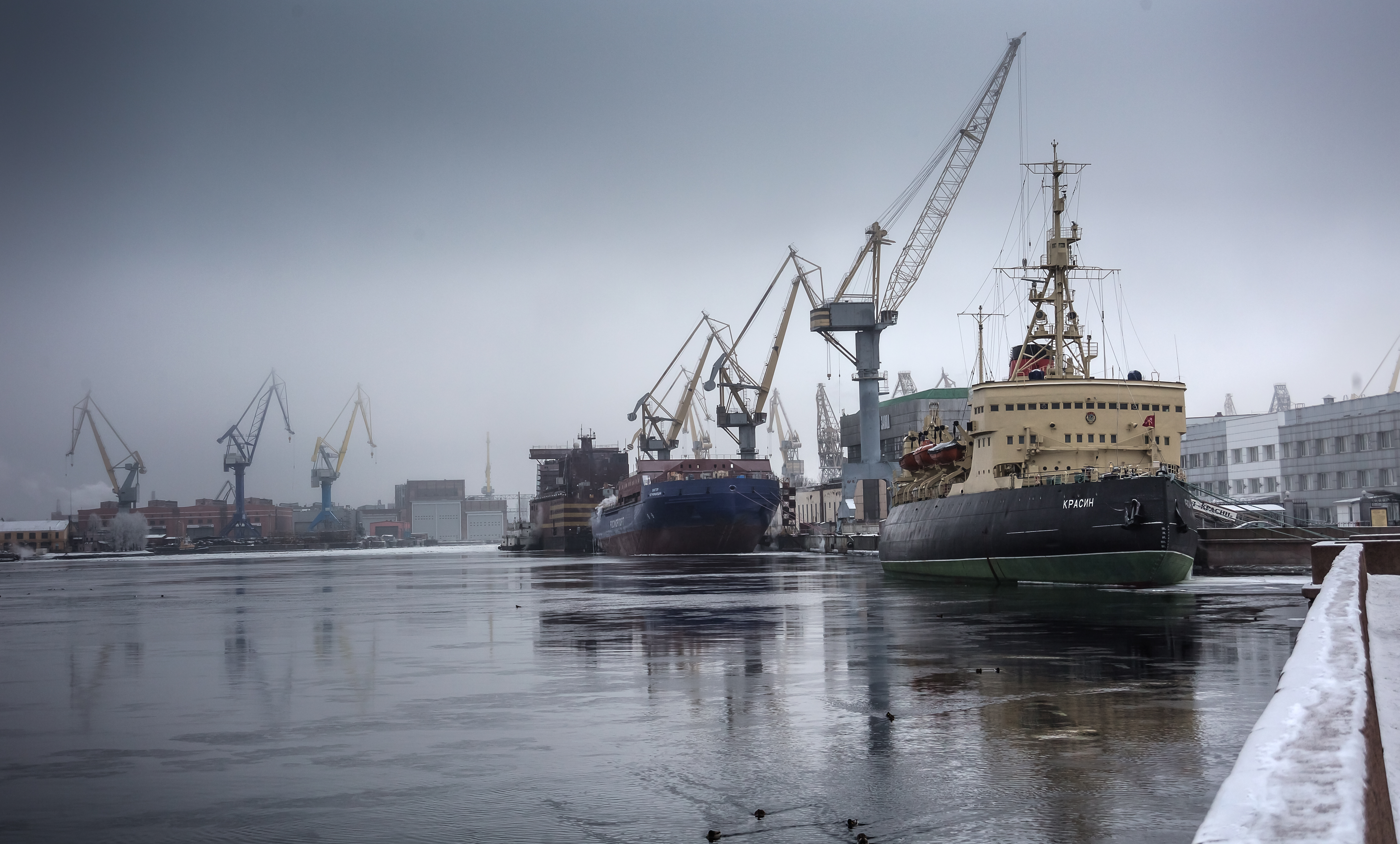 Добрый День! Снимок для домашней работы «Симметрия и отражения». Отражение в воде, конечно, размазано, но снимок мне все равно понравился тем, что здесь есть что поразглядывать. Отражений много и от кранов, от кораблей. На мой взгляд, отражения в этом кадре одновременно добавляют и жизни и объема, смазанность подчеркивает что хоть и зима, хоть местами и лед, но все равно вода течет, а ветер все равно дует, утки крякают, несмотря на зиму и выходной день. А ледокол «Красин» (в котором сейчас музей) хочет качнуться, порвать канаты и втихаря смыться негромко напевая: «Было время, я шел 38 узлов, и веселый вал резал форштевень…» :) Одинаково замершее положение кранов и отсутствие людей говорит о выходном дне. На снимке много ритма и дополнительных осей симметрии: Краны слева образуют ритм и обращают взгляд к кранам справа (они частично скрыты передним планом). Снимок разделен пополам краном посередине и получается что левый и правый берега подобны, только слева еще стоят корабли. Между кораблями посередине стоит еще кран… и образует еще одну ось симметрии :). Снимок темноватый (на самом деле была изморось и слабый туман местами, из облака периодически падал снег). Контрастным получился только ледокол «Красин», что и выделило его на общем фоне. Цвета неяркие, приглушенные, кадр статичный. Главным предметом является ледокол.