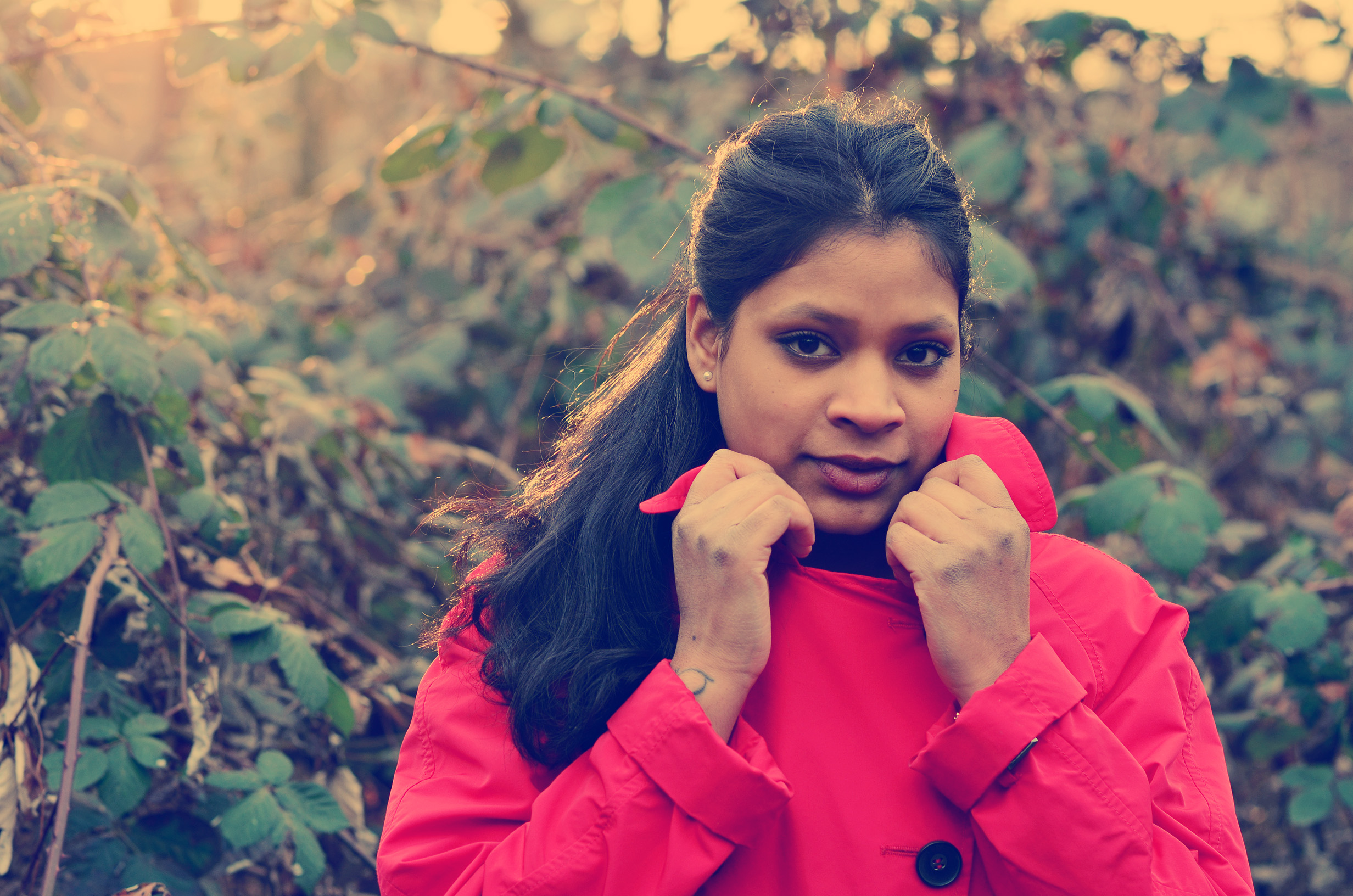 Снимали с ручными настройками, параметры удачные. Выдержка достаточно короткая для съемки с рук, диафрагма открыта, фокусное расстояние большое, значение ISO не увеличивали. Сфокусировались точно. Точку съемки выбрали подходящую, чтобы избежать искажения пропорций. Контровой свет создал интересную контурную засветку и выгодно подсветил волосы модели. Красное на зеленом фоне создает цветовой контраст в кадре, привлекающий дополнительное внимание к модели. Тонирование проделали аккуратно, выглядит уместно и улучшило снимок. Хорошая работа!