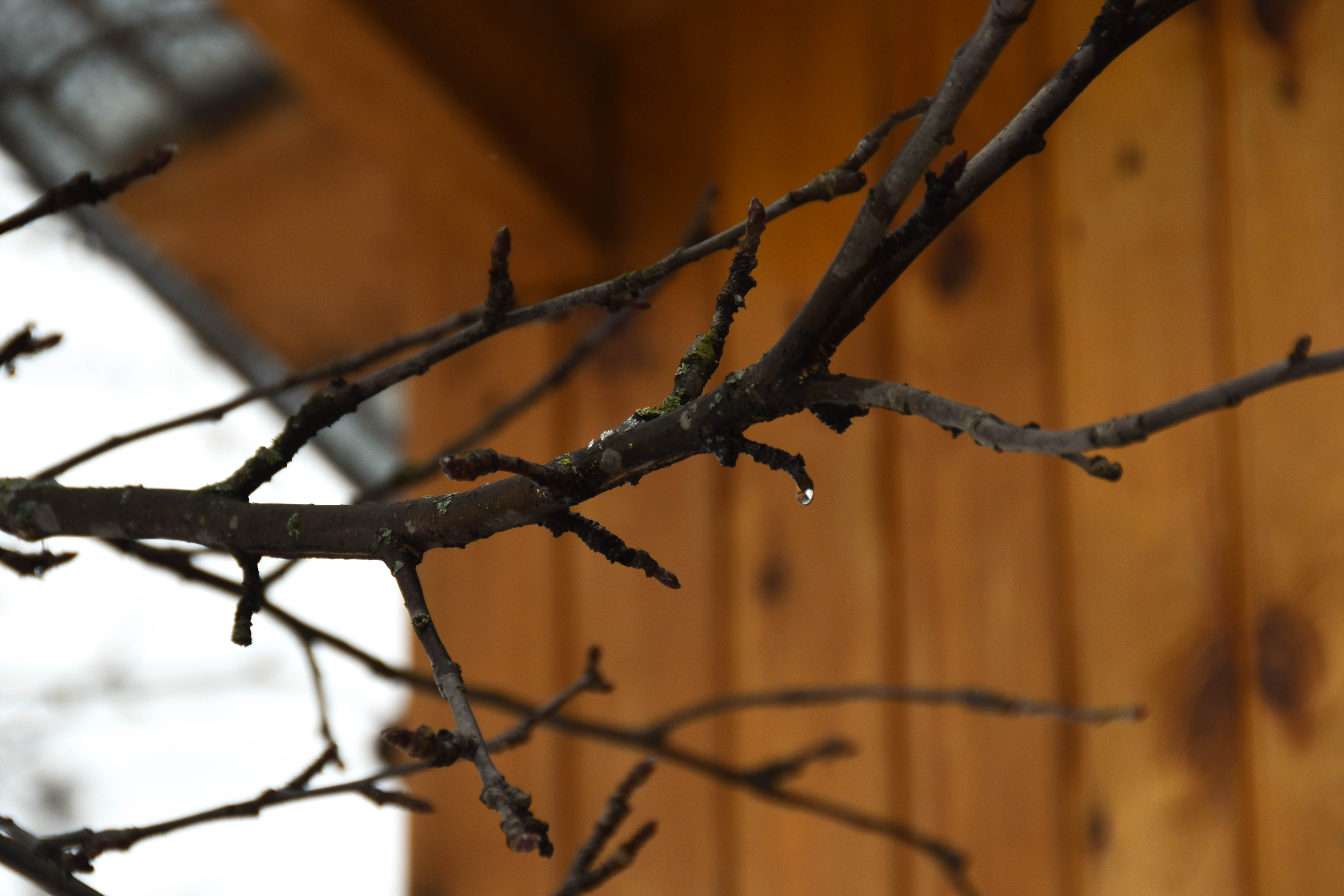 Отличный кадр! Настроение передано здорово- голая, влажная ветка, повисшая капелька. Фон деревянной, теплой стенки усиливает ощущение тепла, приближающейся весны. По технике- верно камеру настроили, длинный фокус, открытая диафрагма, короткая выдержка- с резкостью, экспозицией проблем нет!