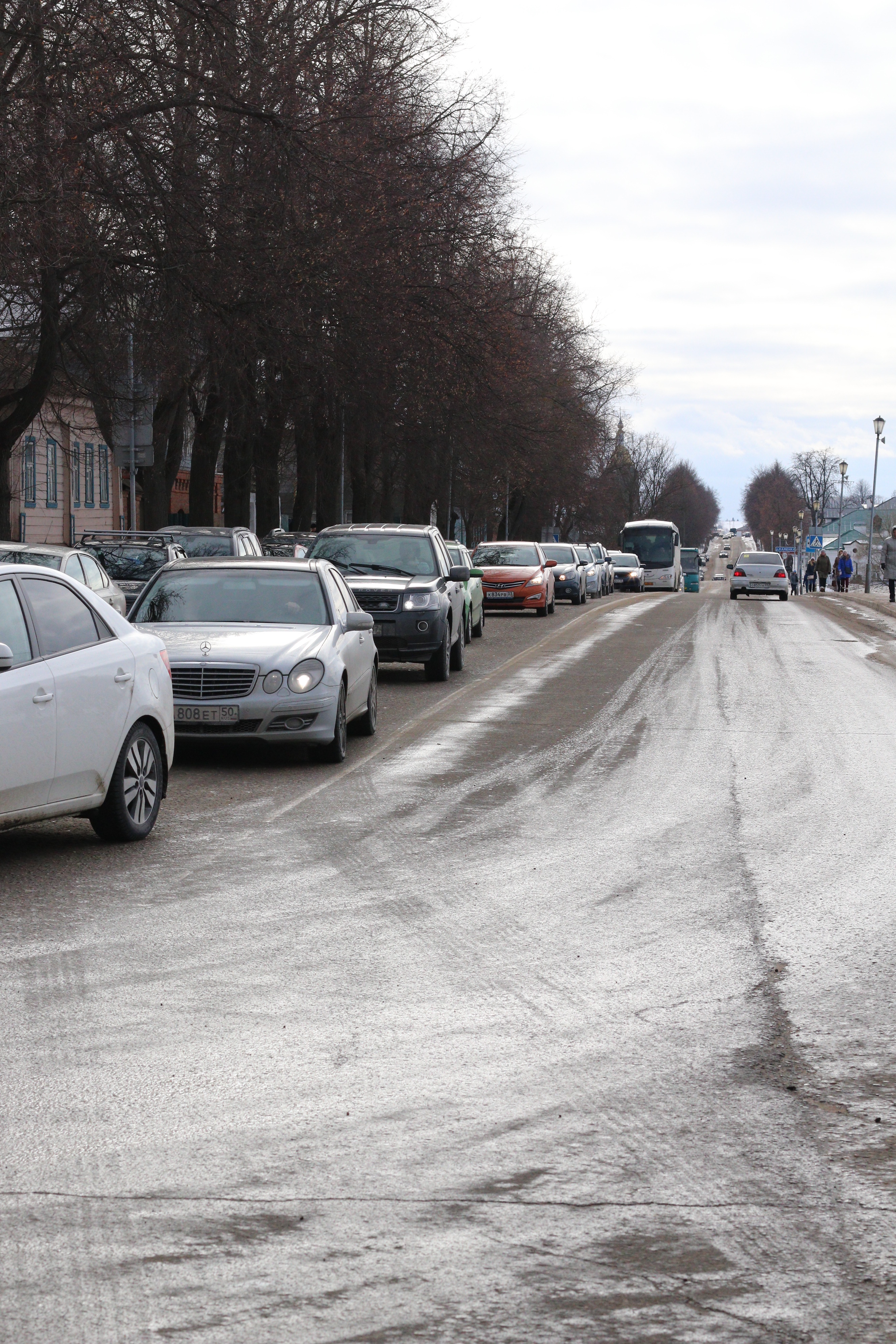 Мы радостно выезжаем из Суздаля, когда столпотворение только начинается, дорога в город перекрыта, все парковочные места заняты, а на въезд вереница машин. Перспектива кадра видна хорошо. Так же видна перспектива прибывающих найти место для парковки.