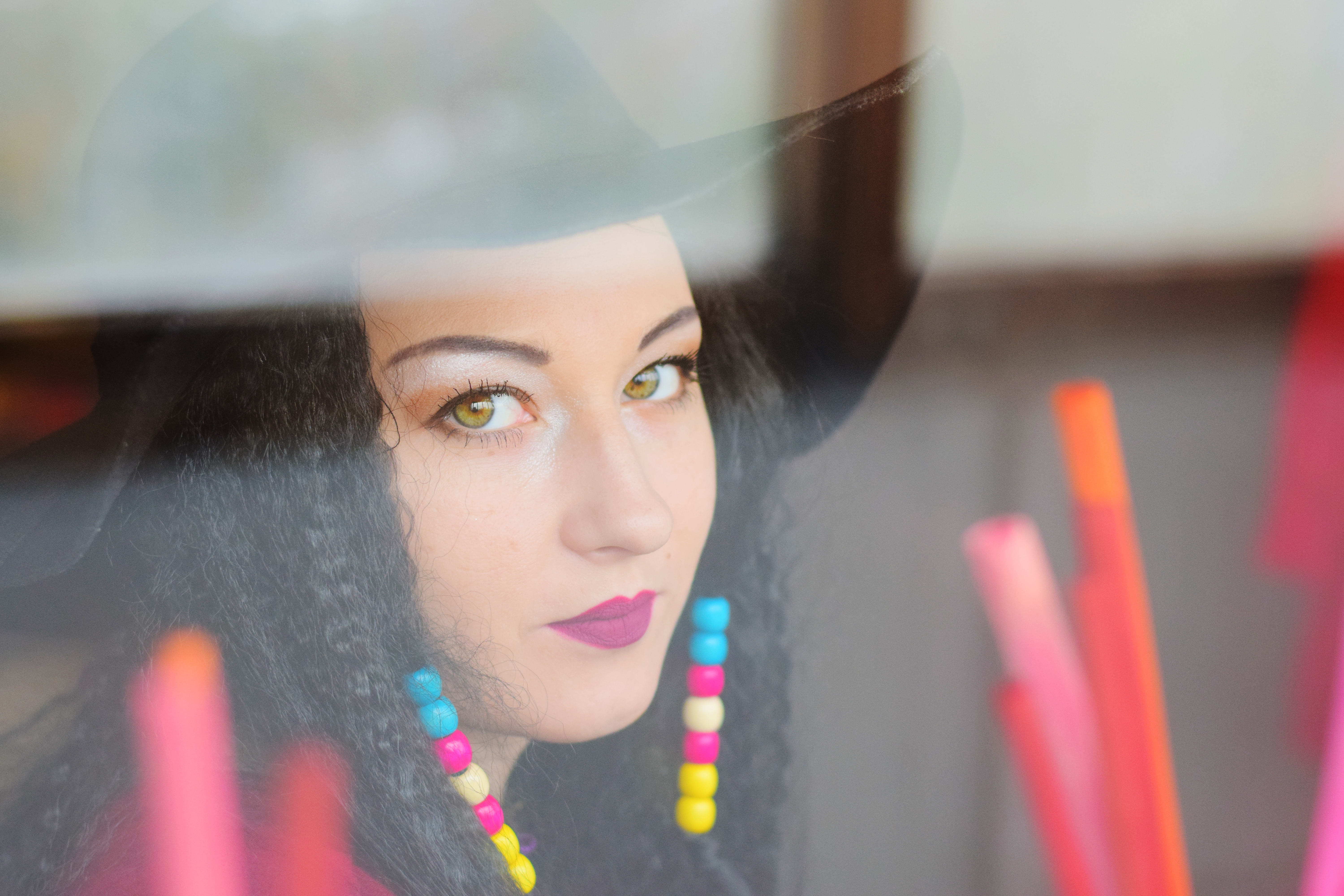 Здорово смотрится сочетание светлых бликов от стекла на переднем плане и глаз модели в более тёмном просвете, создаётся отличный визуальный акцент на выразительном взгляде и мимике главной героини, переданы эмоции, есть настроение.
