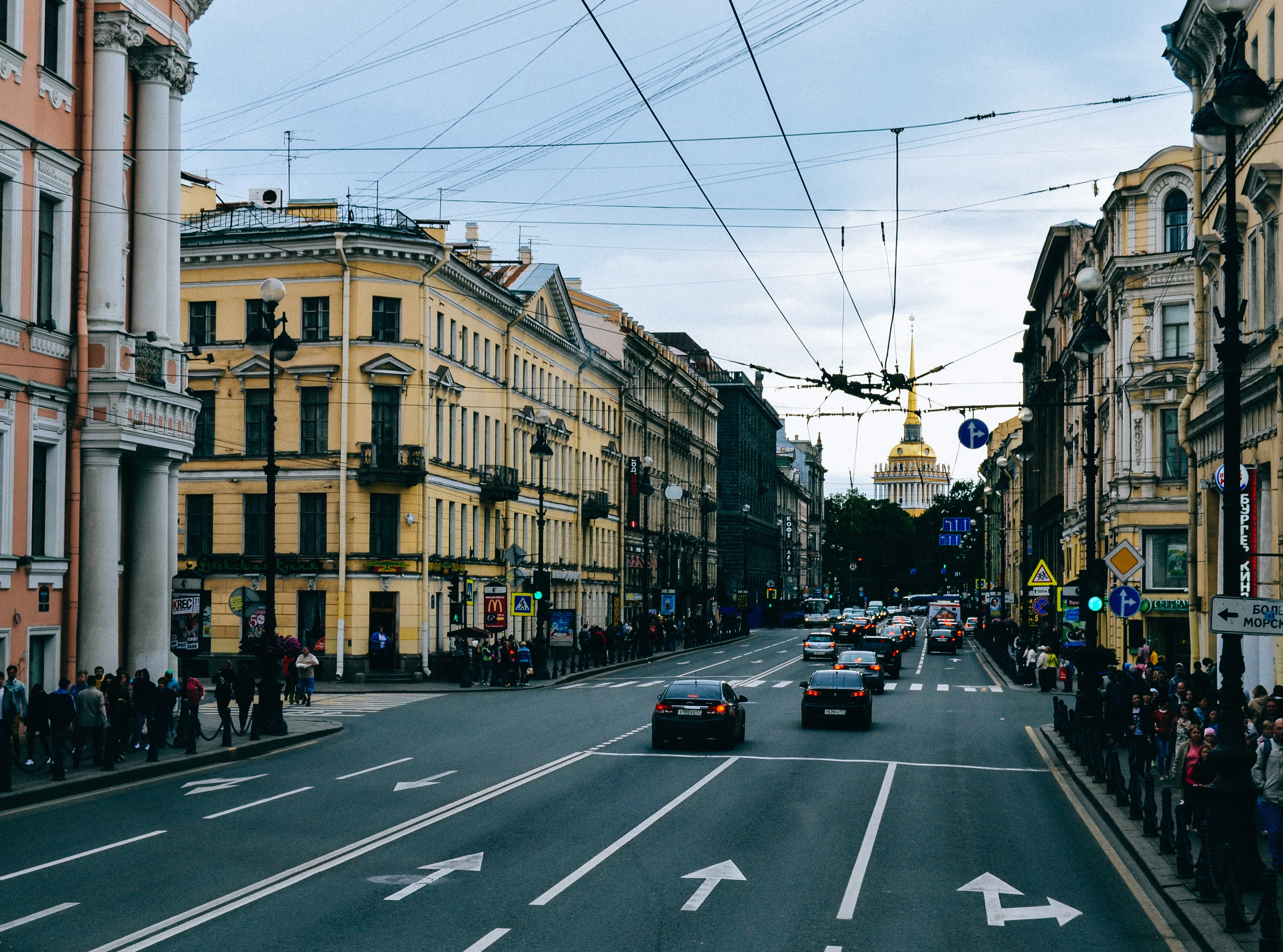 Линии, проводов, дороги и дорожной разметки образуют удачный визуальные направляющие от переднего плана к дальнему, автомобили придают снимку более динамичный характер, здание со шпилем на дальнем плане играет роль мощного визуального центра изображения.
