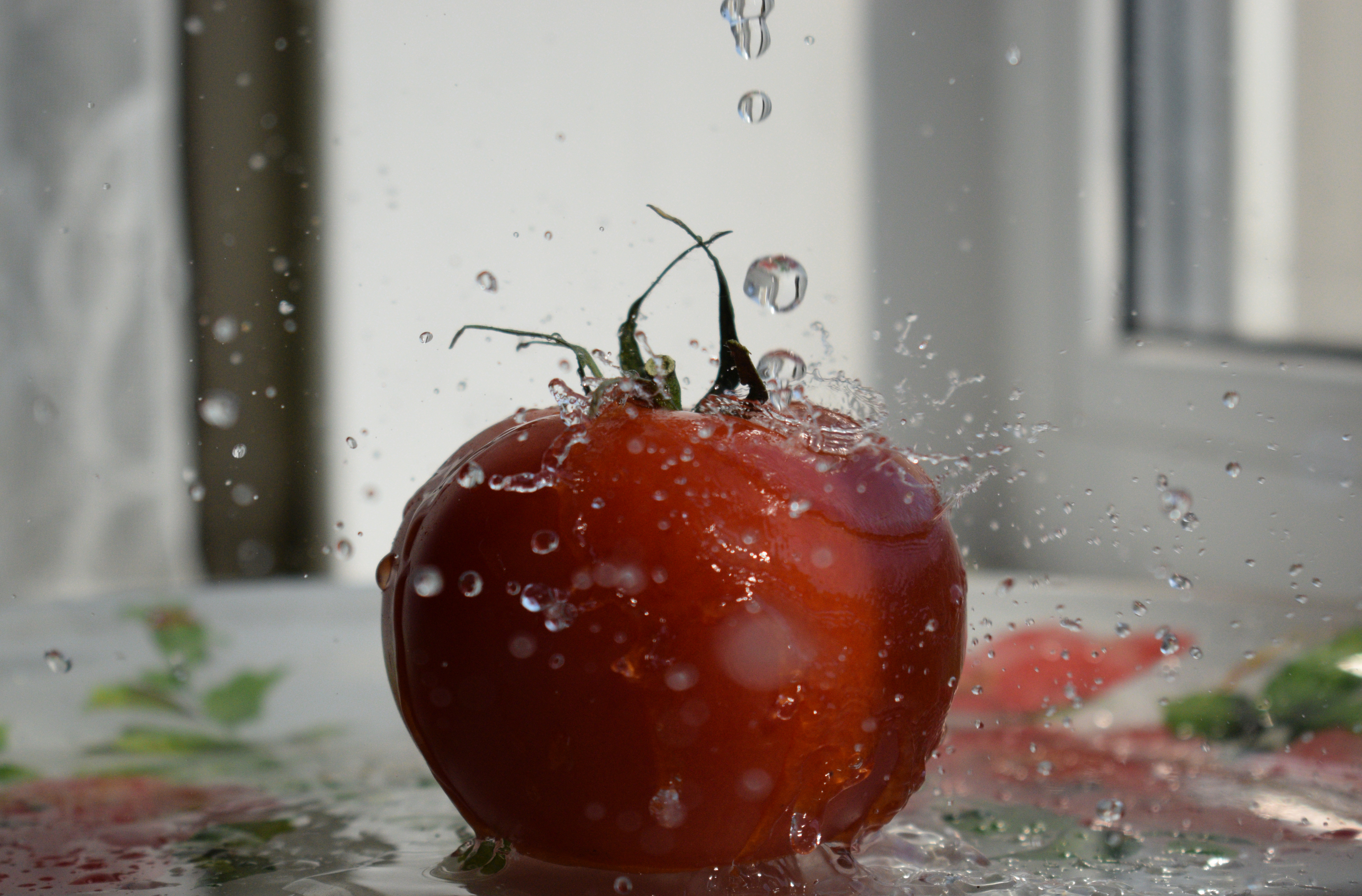 Ух как здорово получилось, благодаря короткой выдержке 1/4000, удалось отлично заморозить момент и получить резкий кадр. Повышение Исо до 1000 единиц вполне оправдано, ведь это позволило добиться короткой выдержки и избежать маза. Фокусировка именно на капелька и помидорчике .