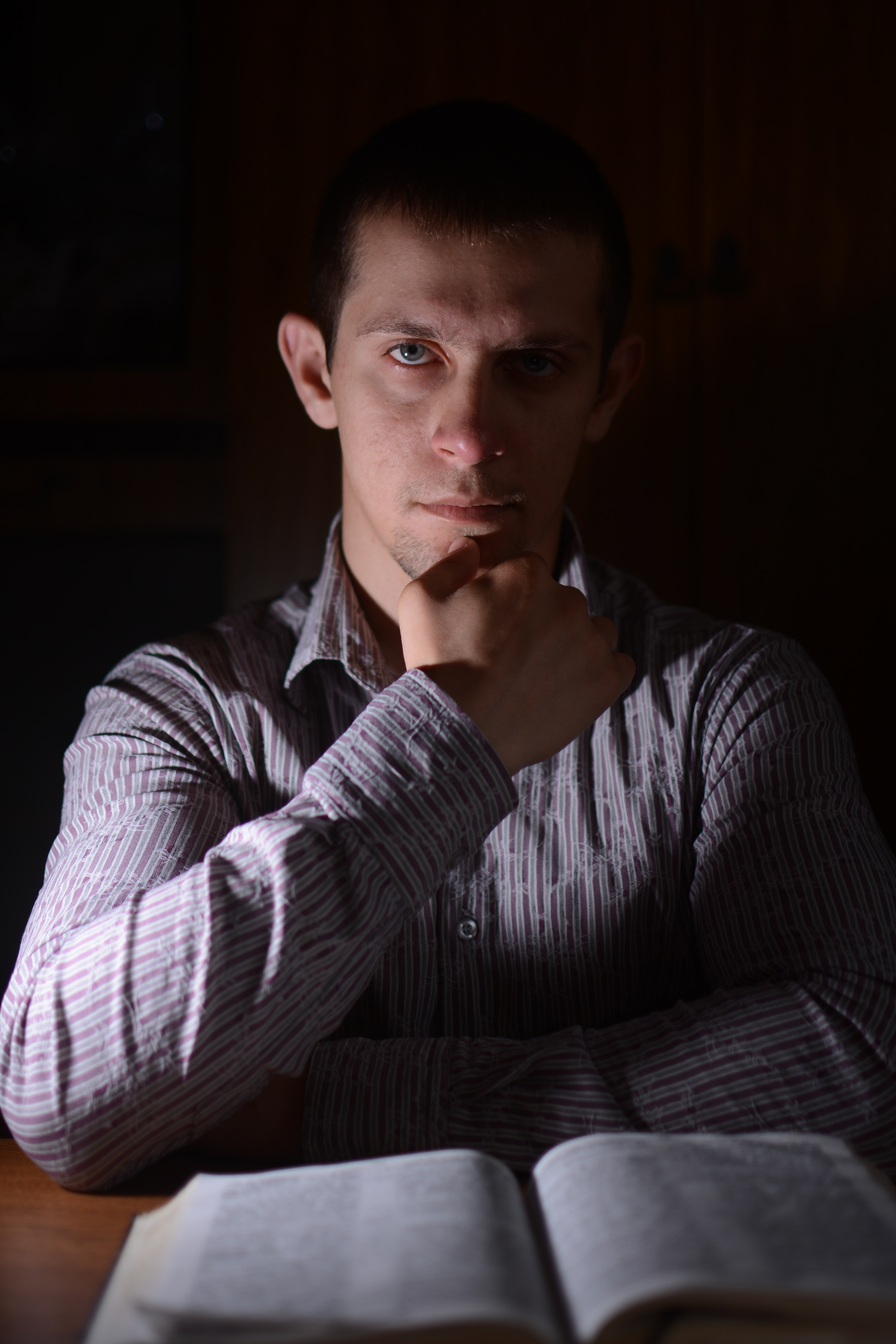 Интересный портрет у Вас получился. Свет смотрится довольно драматично. Благодаря тому, что он падает сбоку, объём проработан. Резкость точно навели.